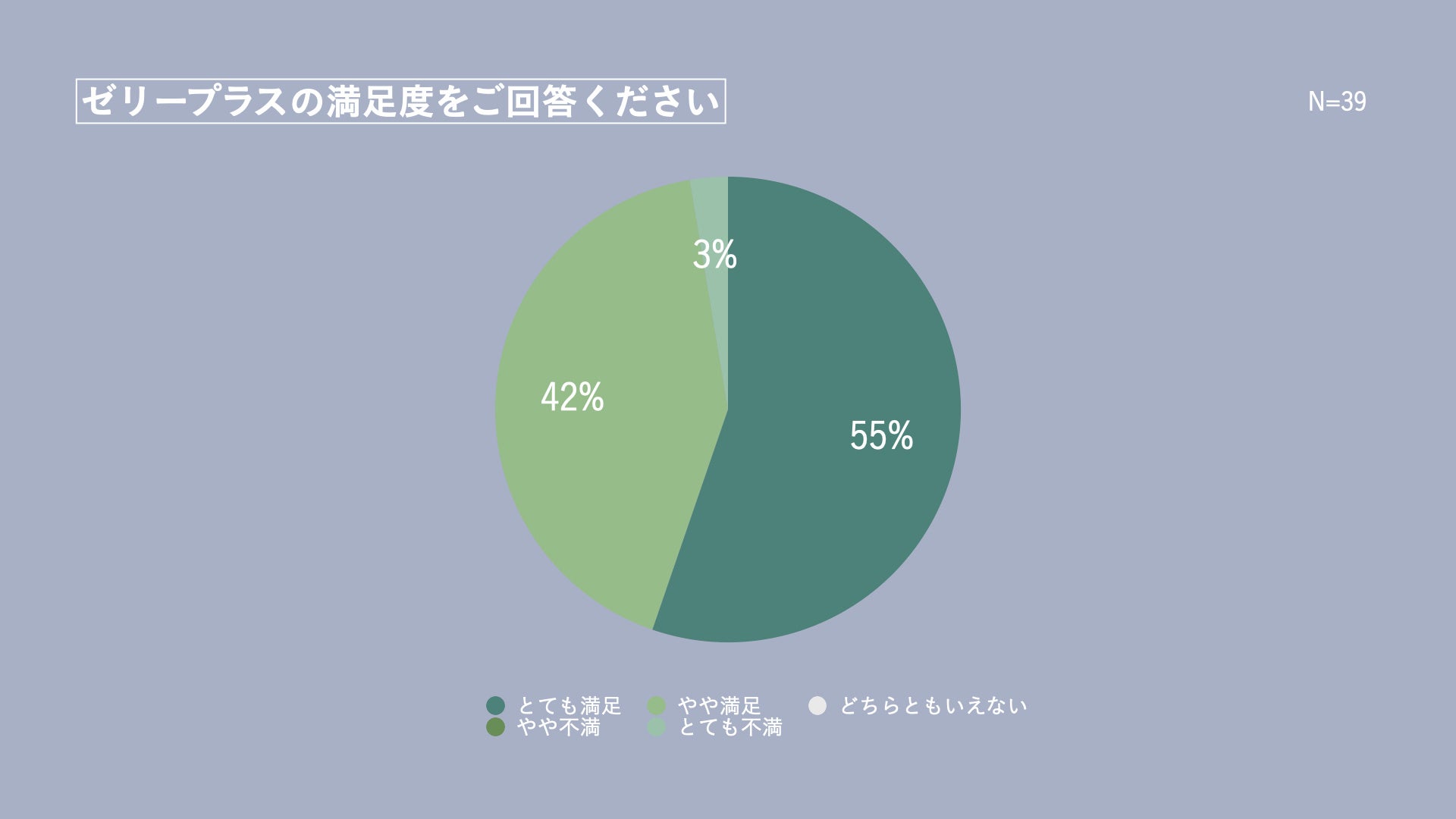 ゼリープラス定期購入者39名にアンケート調査(*1)を行った結果、ゼリープラスの満足度について「とても満足」「やや満足」と回答した方を合わせると約97%となり、高い満足度を得ていることが分かりました。満足の理由としては、「味がとてもおいしい」「手軽に食物繊維がとれて良い」といった声が寄せられました。