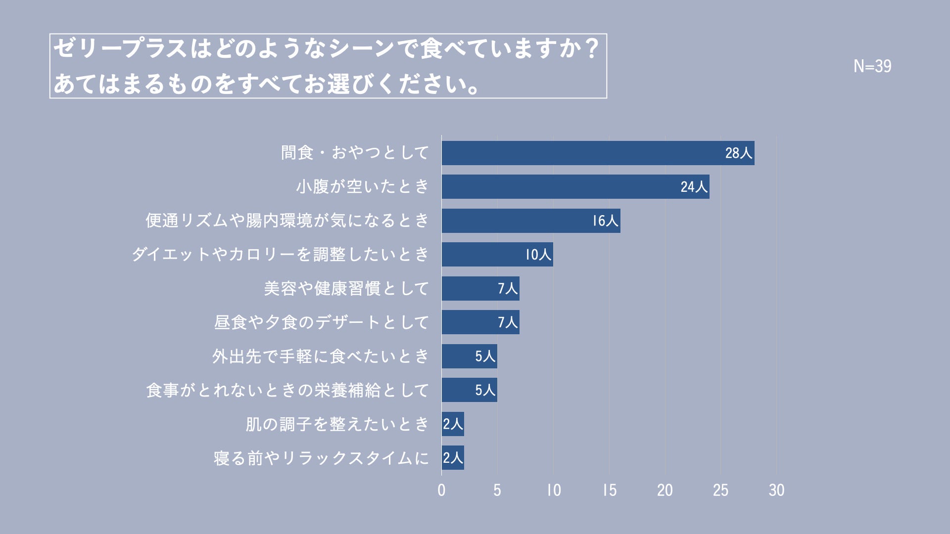 『ゼリープラスを、日常のどのシーンで食べていますか?』と尋ねた調査では、「間食・おやつとして」が最も多く28人、「小腹が空いたとき」が24人という結果となりました。(複数回答可)