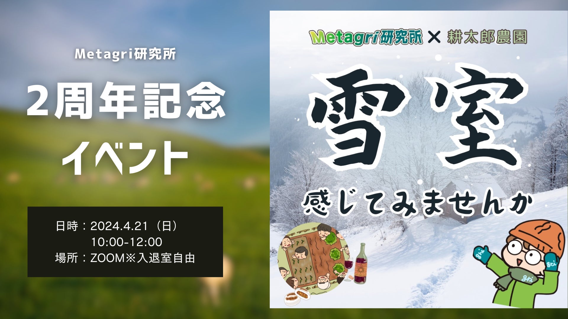 Metagri研究所の設立2周年を記念し、2024年4月21日(日)に「開所!2周年記念イベント~オンライン雪室ツアー&雪室熟成の食体験~」を開催いたします。