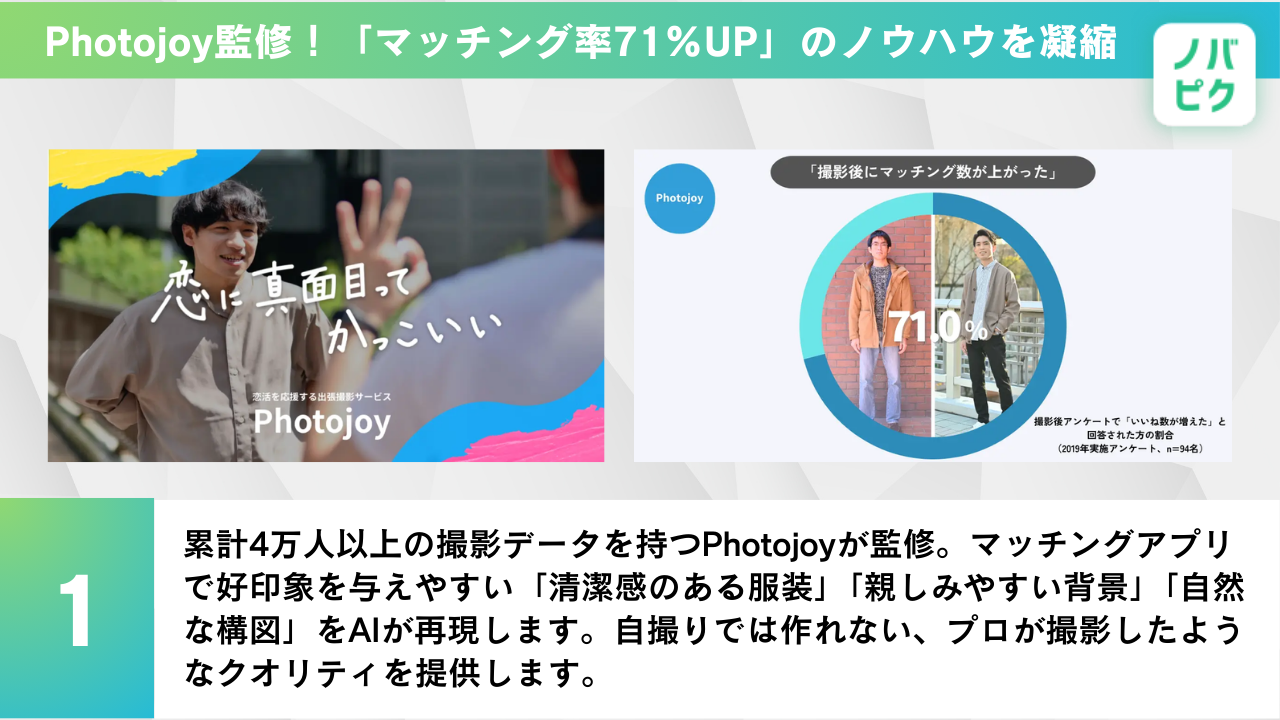【累計4万人の撮影実績】Photojoy監修!自撮り1枚からモテる他撮り風マッチングアプリ用の写真を生成するAIサービス『ノバピク』をリリース