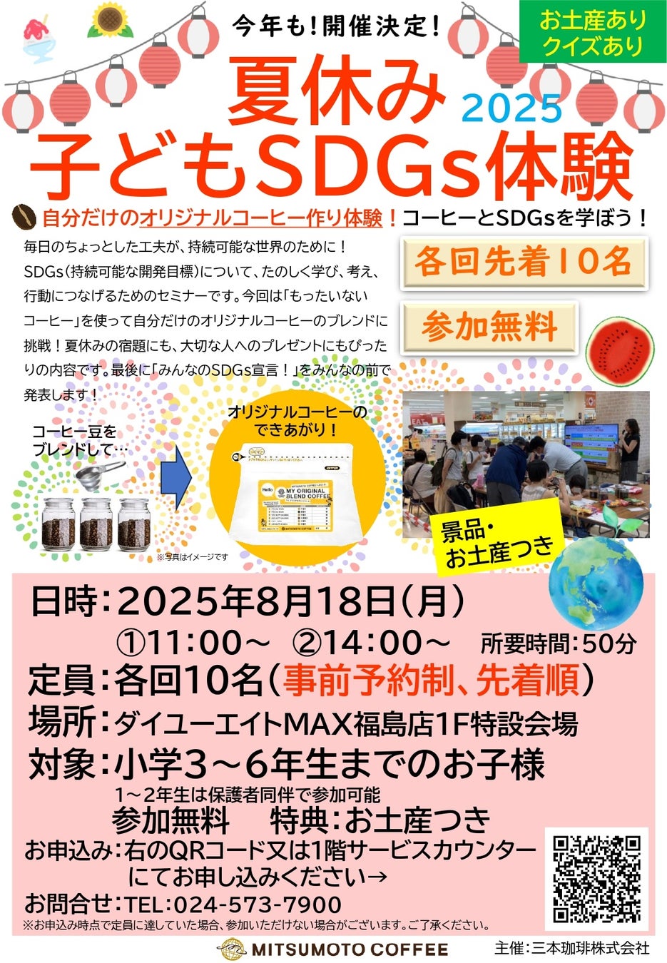 2025年8月18日(月)にダイユーエイトMAX福島店にて、食品寄贈式と「夏休み子どもSDGs体験」が開催されますのでご案内させていただきます。
