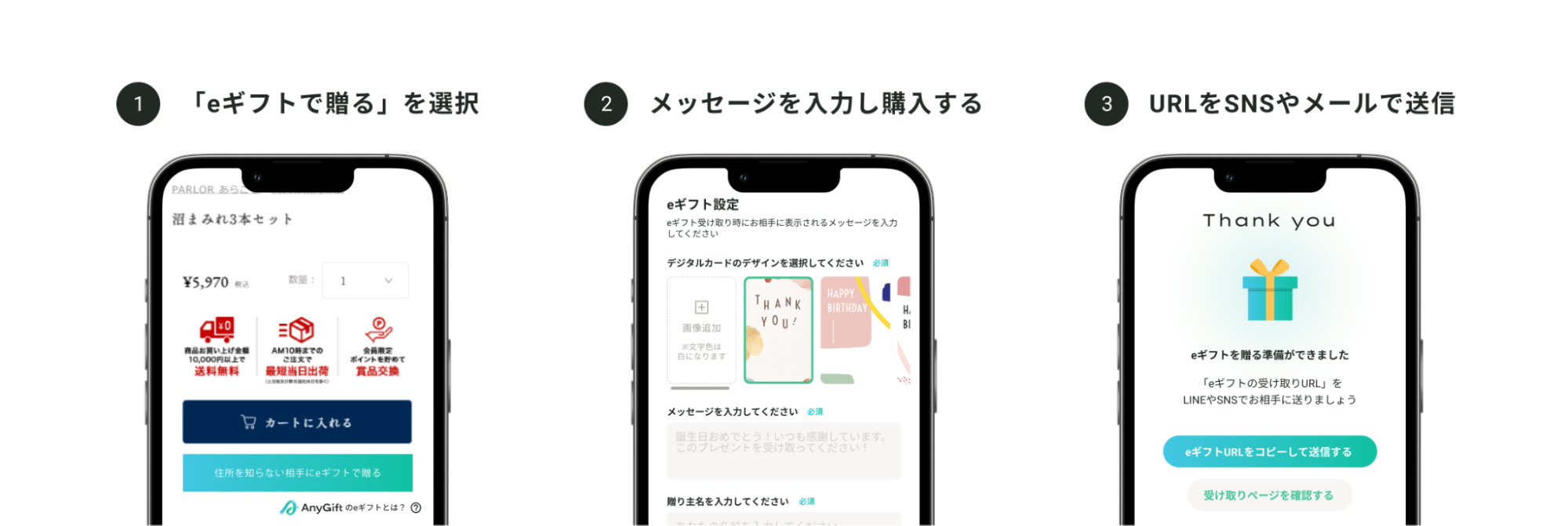 AnyGiftは、相手の住所を知らなくてもLINEやメールで贈ることができる"eギフト機能"を、ECサイトに組み込むことができるサービスです。