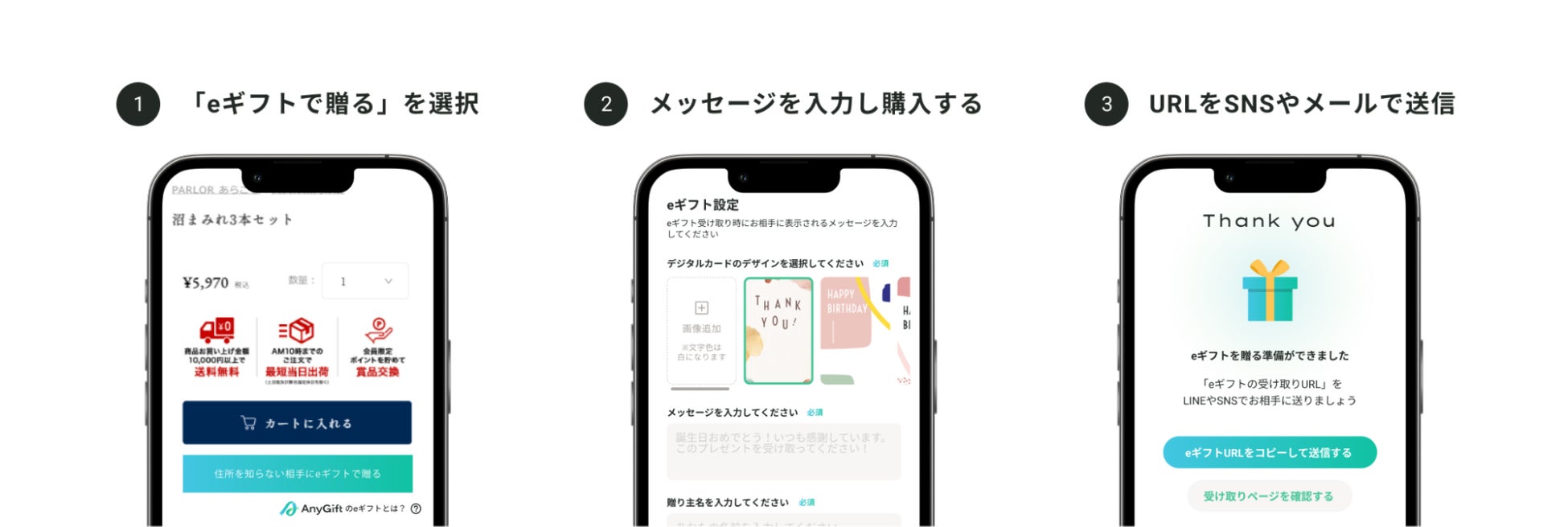 『AnyGift(エニーギフト)』は、相手の住所を知らなくてもLINEやメールで贈れる"eギフト機能"を、自社ECサイトに組み込み・導入ができるサービスです。