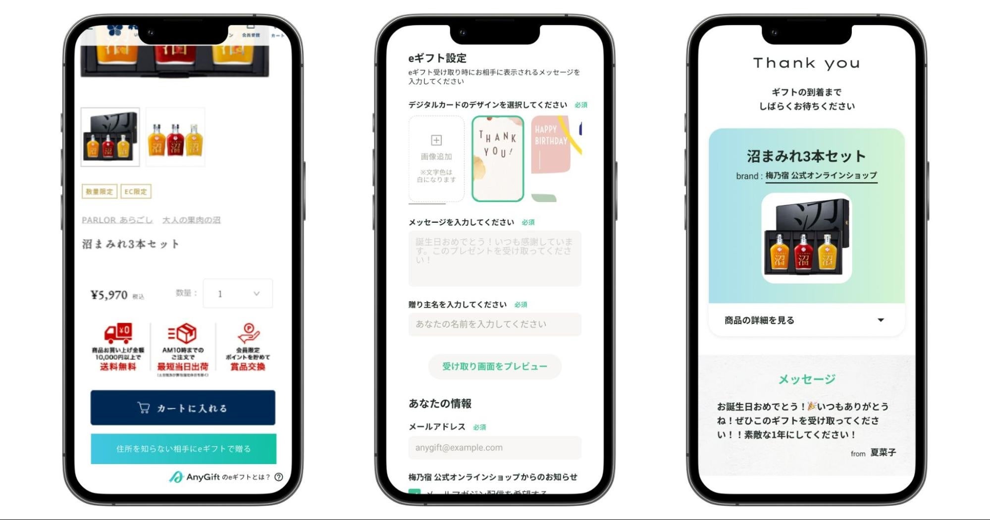 今回、当社のAnyGiftの提供により、「梅乃宿酒造公式オンラインショップ」にて沼まみれ3本セットや世界の別腹3本セットなど、果実を贅沢に使った人気酒がeギフトとして贈れるようになります。