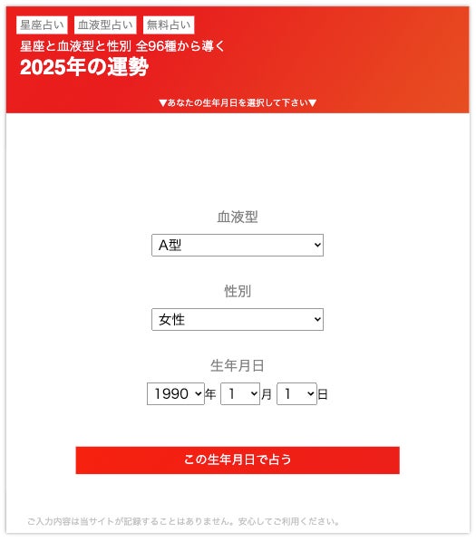 利用者は、①生年月日②血液型③性別の3点からなる全96パターンの区分に分かれたランキング結果を知り、2025年の年間運勢の占い内容と開運のためのアドバイスを受けることができます。