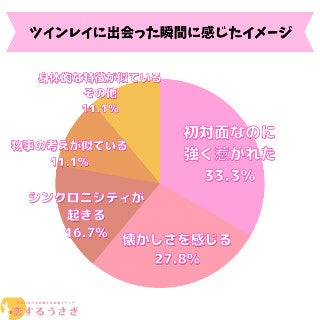 恋するうさぎ編集部が行った「(アンケート内容)」のアンケートによると1位初対面なのに強く惹かれたが33.3%、 2位は懐かしさを感じる27.8%、3位はシンクロニシティが起きる16.7%という結果になりました。