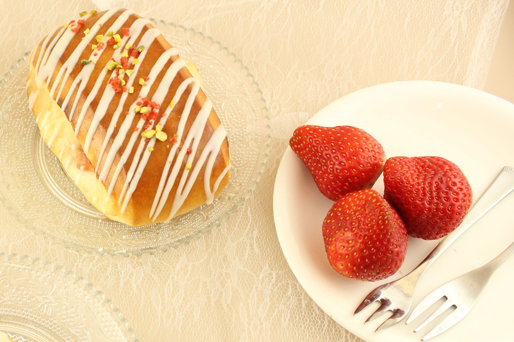 スイートな菓子パン生地に、ホワイトチョコクリーム、あまおうイチゴジャムを巻き込み焼き上げました。