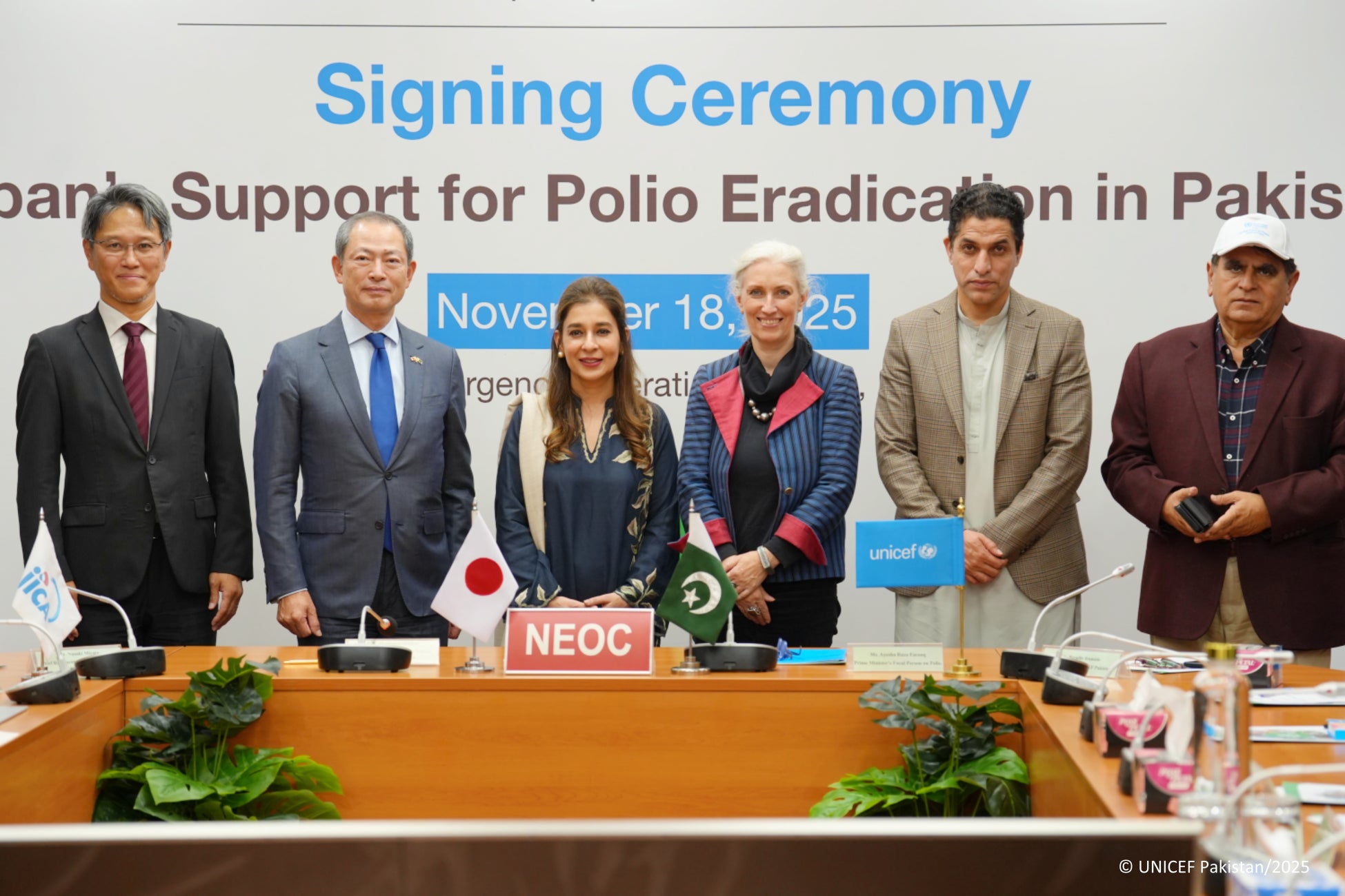 UNICEFパキスタン事務所代表のパニラ・アイロンサイドは、次のように語りました。「日本政府の資金協力は、パキスタンでのポリオ根絶に向けて、これからも極めて重要な役割を果たしていきます。本支援により、すべての子どもがどこに暮らしていてもワクチンを受けられるようになります。子どもたちを守り、保健システムを強化し、ポリオのない未来を築くための日本政府とUNICEF、パキスタン政府、そして国中のコミュニティとのパートナーシップに感謝いたします。」