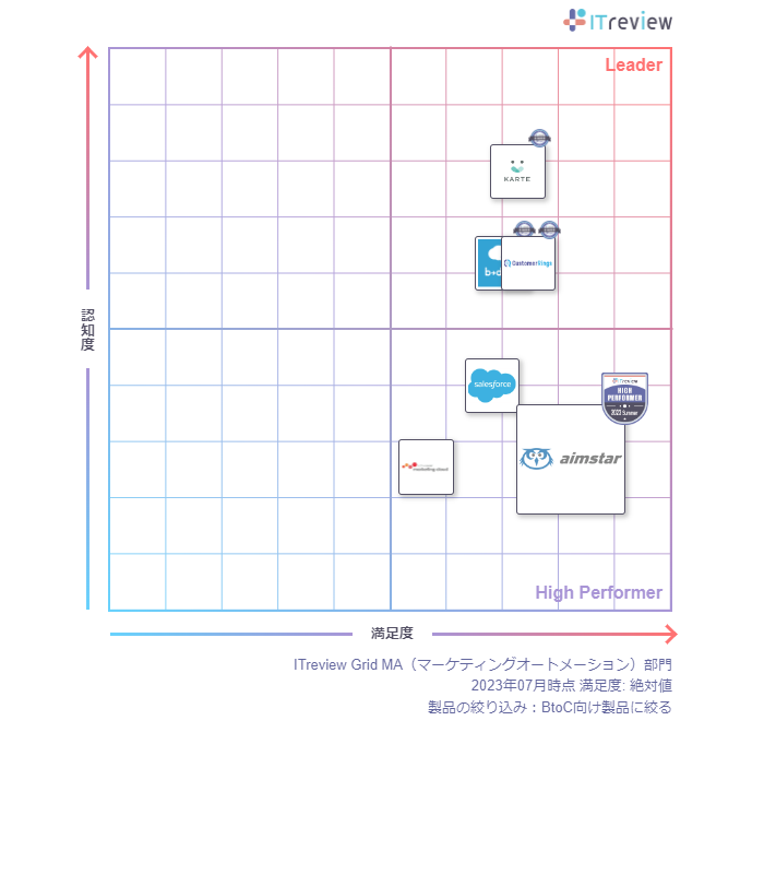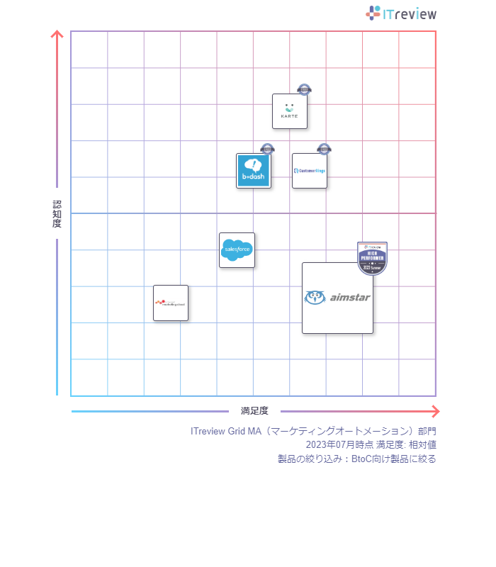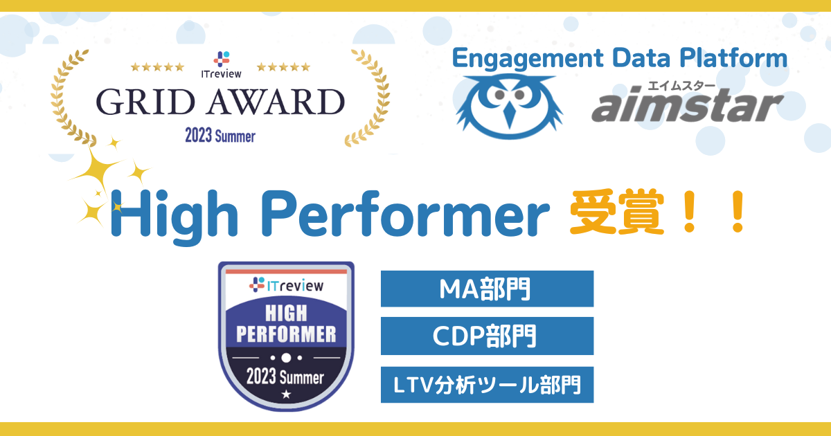 aimstar、「ITreview Grid Award 2023 Summer」のMA、CDP、LTV分析ツール部門で「High Perfomer」に選出
