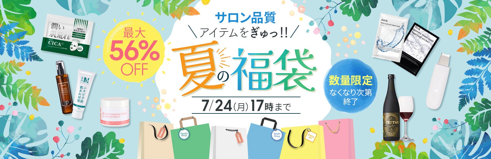 セブンショップならではのサロン品質のアイテムを集めた、夏の福袋キャンペーンを開催中!シートマスクやボディケア商品など、6種類の特別な福袋を数量限定でご用意いたしました。なくなり次第終了のレアな福袋をお見逃しなく!