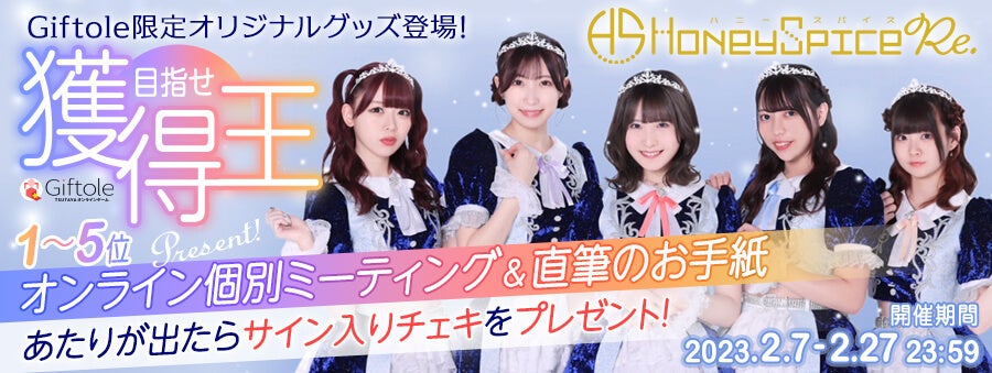 期間中、「ハニースパイスRe.」のオリジナルコラボグッズを最も多く獲得いただいた総合獲得ランキング1~5位の方に、「オンライン個別ミーティング」と「直筆のお手紙」をプレゼント!