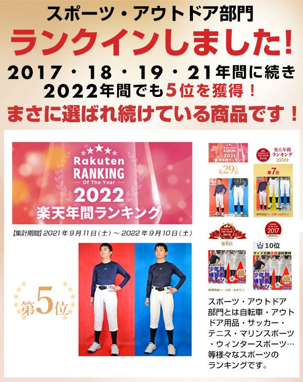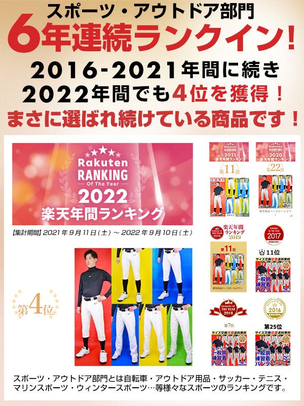 この「楽天年間ランキング2022」の「スポーツ・アウトドア部門」で、弊店の人気商品「ミズノ GACHI 練習用ユニフォームパンツ」の大人用・子ども用が、それぞれ4位、5位に入賞しました!