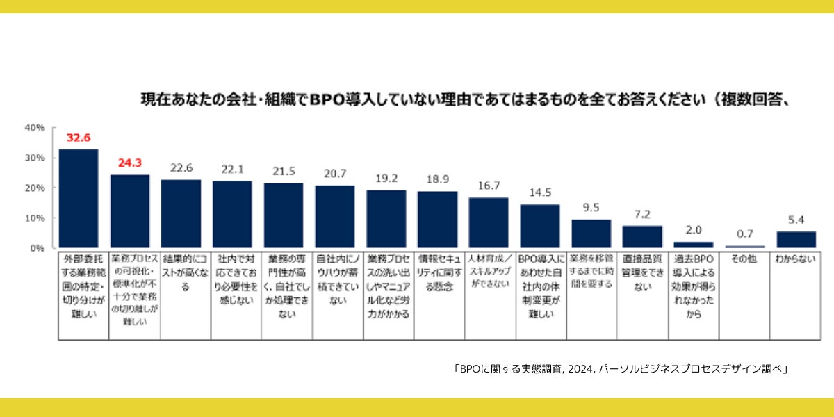 32.6%の担当者が業務の切り分けが難しく、BPOできないと回答。マニュアルの活用で業務を可視化しBPOの導入支援を行う。▶︎企業情報:https://www.bod-grp.com/company/