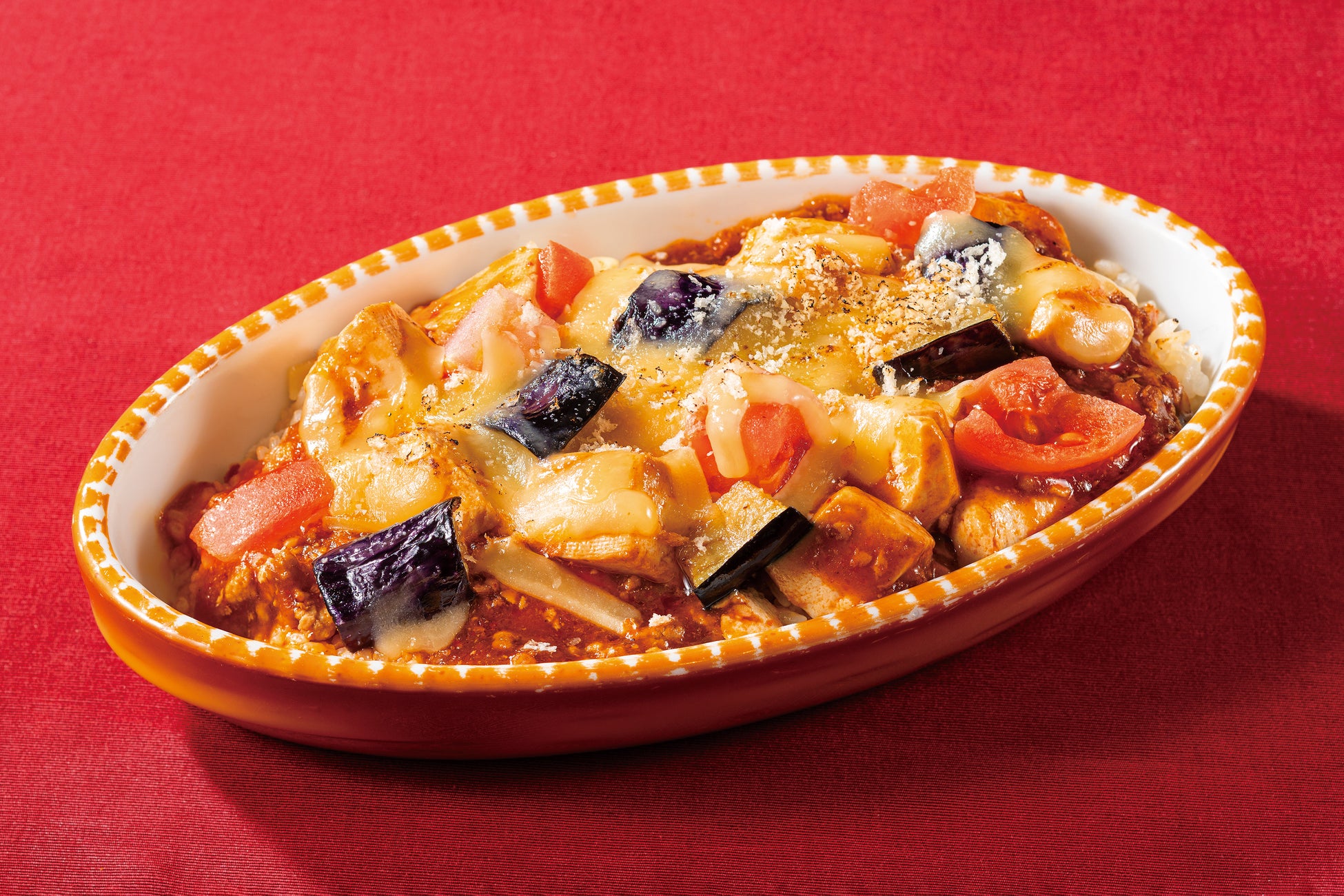 牛肉たっぷりの麻婆豆腐をカレー風味のチャーハンの上にのせ、チーズとともにこんがりと焼き上げた新感覚の麻婆豆腐です。