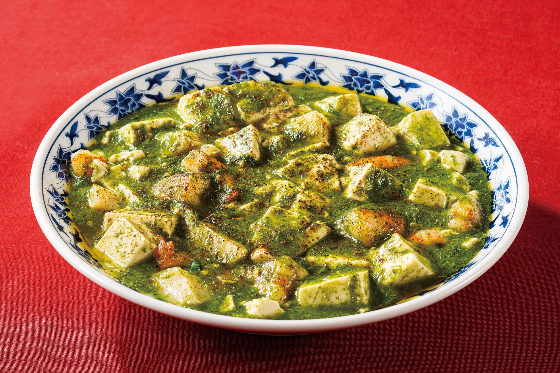 ほうれん草と爽やかな辛味の青唐辛子を細かく刻み、香り高い青山椒で仕上げた、海鮮の旨みを堪能できる一品。