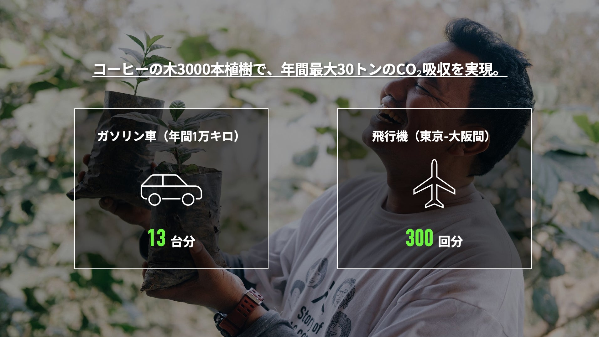 BIKAS COFFEEの植樹プロジェクトは、5年間で累計3,000本の植樹を行い、年間最大約30トンの二酸化炭素(CO₂)の吸収の効果が見込まれています※1。このCO₂吸収量は、ガソリン車で約10,000km走行する際の排出量に換算※2すると、およそ13台分あるいは東京〜大阪間の飛行機の片道移動に換算※3すると300回分に相当し、カーボンオフセット効果を大きく発揮しながら持続可能な農業と経済価値の両立を実現しています。