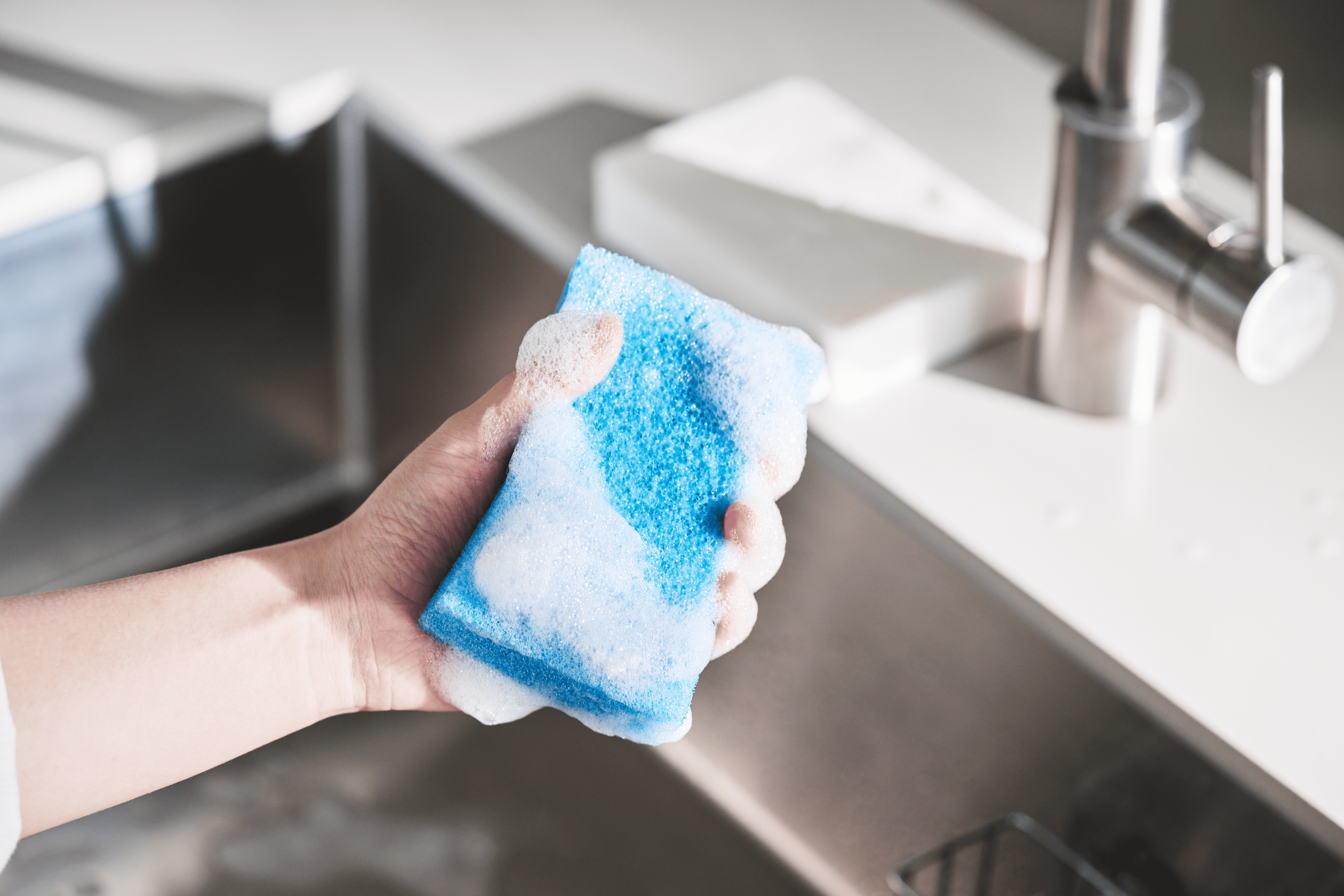 ダイニチ・コーポレーションは創業から、食器洗い用固形洗剤の製造販売を行っています。製造から販売を行う中で、固形洗剤と相性の良いスポンジを研究し、高品質ポリウレタンを使用した、従来のスポンジの概念を覆す「サンサンスポンジ」が生まれました。半年以上使えるほど丈夫で長持ちなので、ごみの削減に。