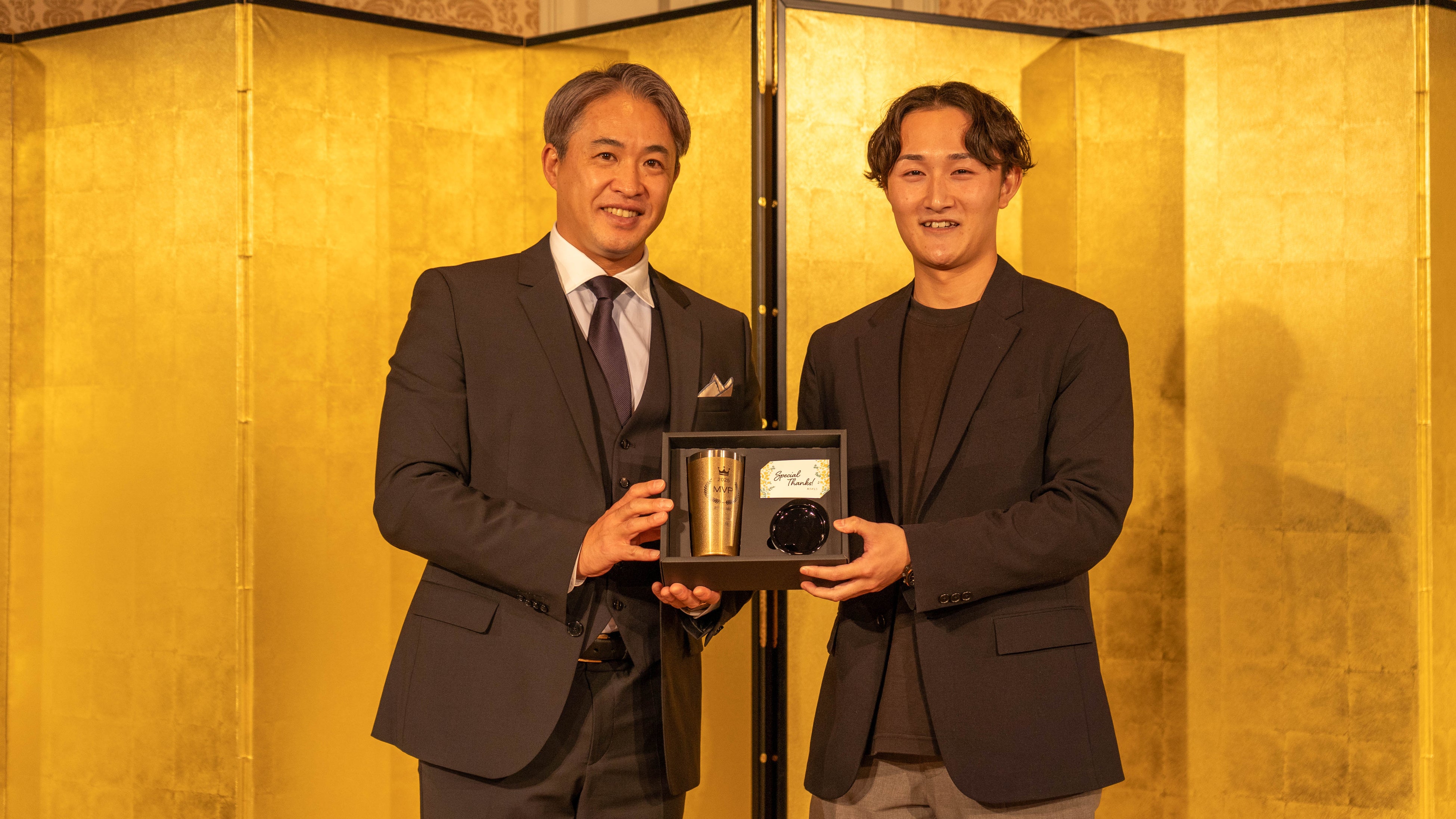 その中から、プロスポーツ選手として数々の表彰・活躍実績をお持ちのお二人に、年間優秀社員を表彰する『明豊AWARD 2025』の趣旨にご賛同いただき、プレゼンターとしてご登壇いただきました。2025年度新卒入社した従業員で最も早く契約を獲得した従業員に贈る「新人賞」のプレゼンターをプロテニス選手の「園田 彩乃」さん、1年間で最も多くの用地仕入れ契約を獲得した社員に贈られる「ベストデベロッパー賞」のプレゼンターを元プロ野球選手の「五十嵐 亮太」さんにご担当いただきました。