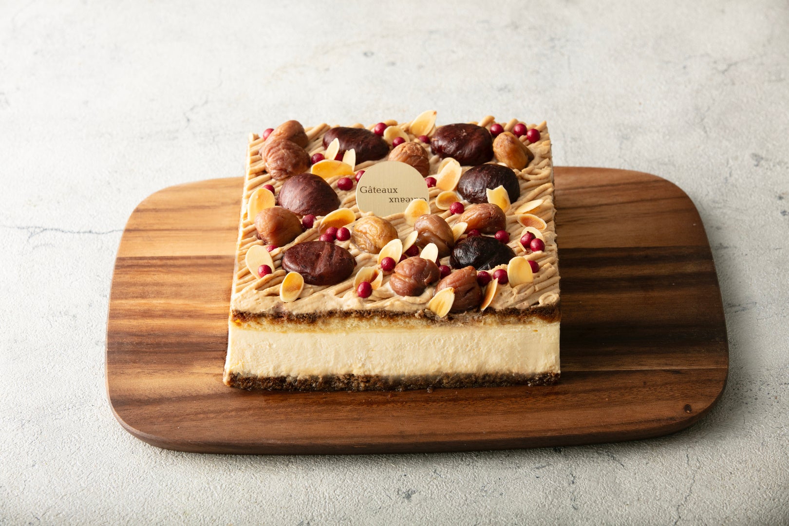ティラミスの上にモンブランを重ねたケーキ。渋皮栗の甘露煮、皮むき栗の蒸し煮、アーモンドスライス、