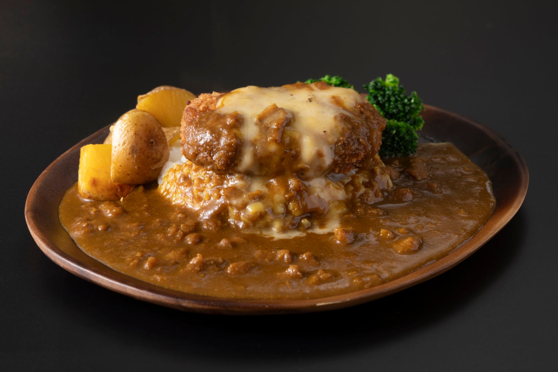 説明:玉葱たっぷりのカレーと蒟蒻ミートのメンチカツがマッチ