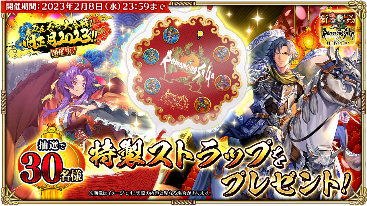 株式会社アカツキゲームス(本社:東京都品川区、代表取締役:戸塚佑貴、株式会社アカツキ100%子会社)は、株式会社スクウェア・エニックス(本社:東京都新宿区、代表取締役社長:松田洋祐、以下「スクウェア・エニックス」)から好評配信中の「ロマンシング サガ リ・ユニバース」において、2023年2月1日(水)より「みんなで大合戦!旧正月2023!!」を開催することをお知らせいたします。