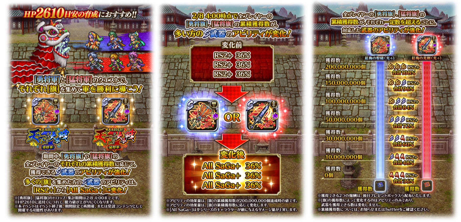 この旗の累積獲得数に応じて獲得できるS武器のアビリティが強化され、多くの旗を集めた軍のS武器のアビリティは、「RS2+」から「All SaGa+」に変化します。