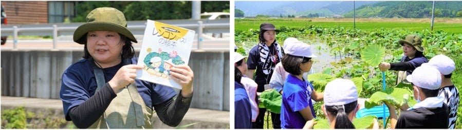 特に蓮の葉の仕組みには児童も興味津々で、「葉脈を通じて水が噴き出すのが楽しかった」、「蓮の葉に水滴を垂らすと水滴を弾いて水が転がるので大変面白かった」など歓声を上げていました。当社は本プロジェクトを通し産学官の連携を深めながら、子どもたちの食への関心を育み、考える場を提供してまいります。