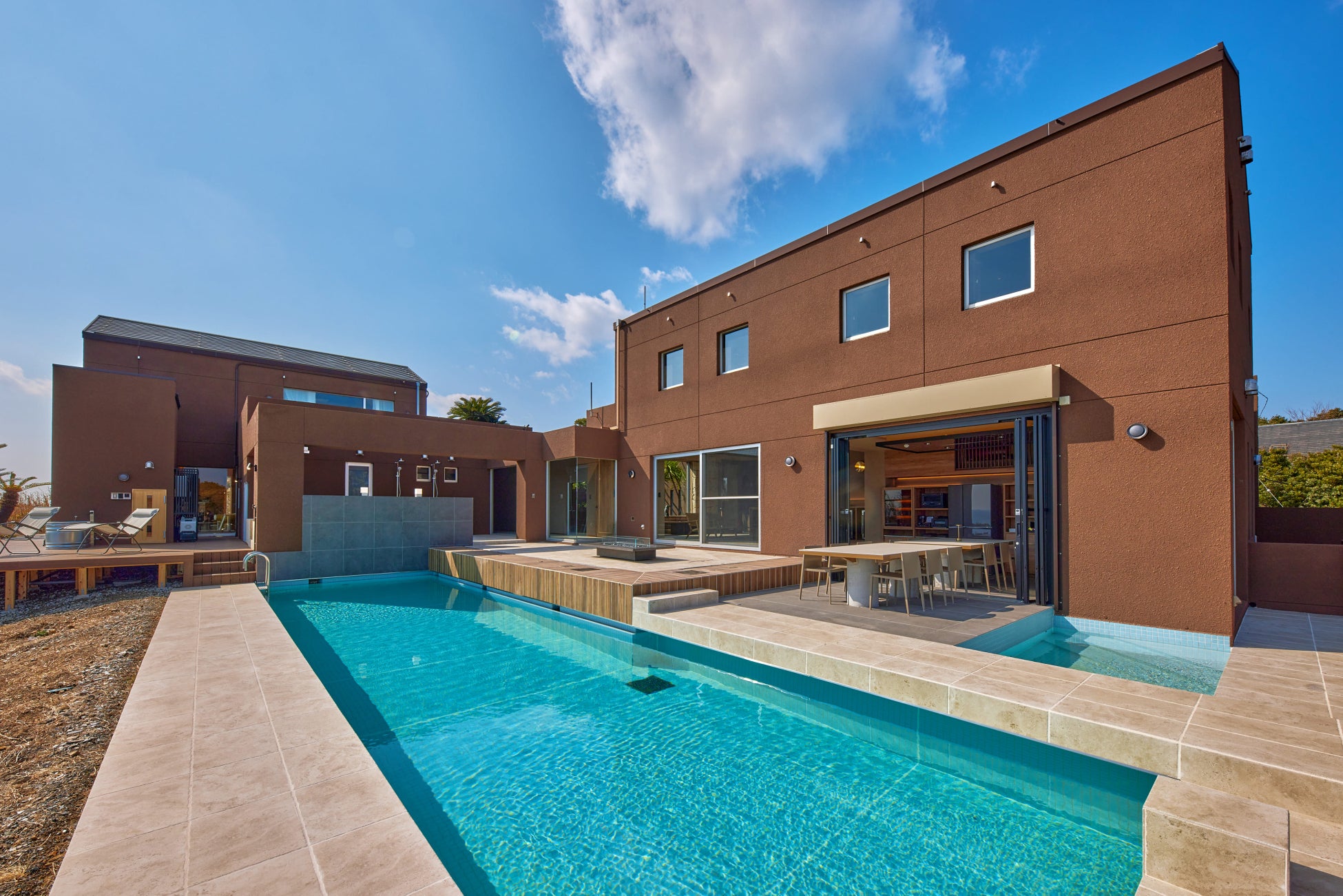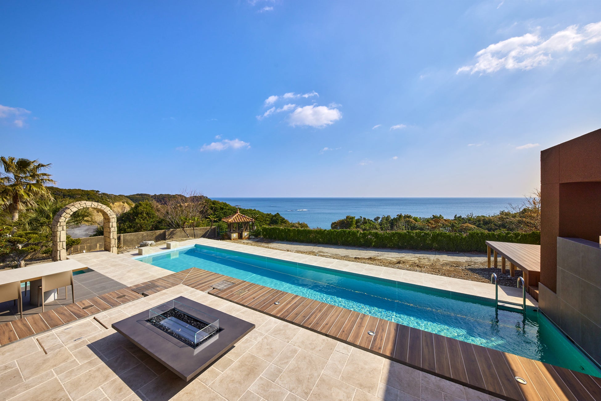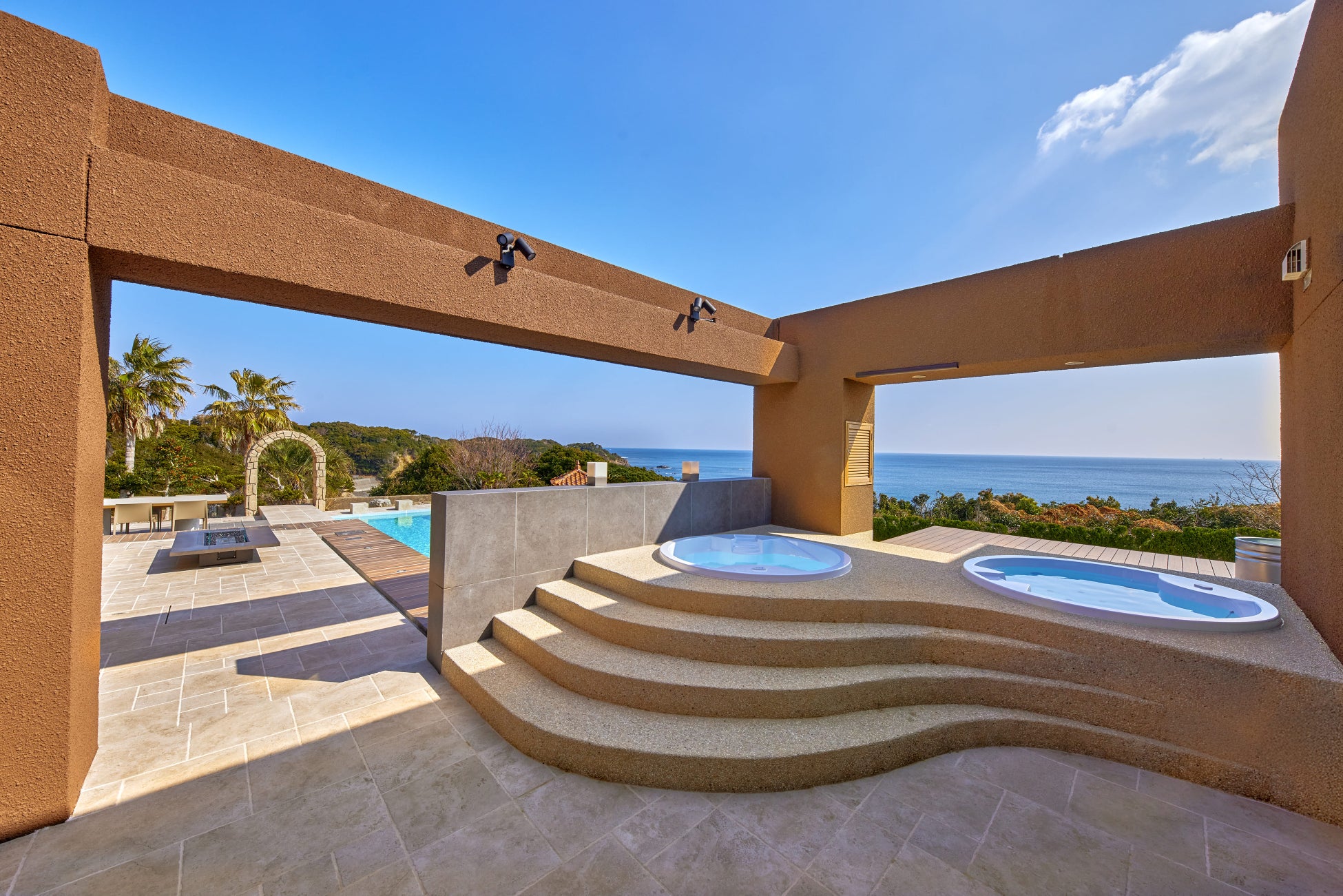 本施設は断崖の上に位置する、大空間を有するプライベートサウナとプール付きのヴィラです。目の前に広がる大海原と一体となる非日常空間が特徴で、今回のレンタルスペース利用では、宿泊に先駆けてその一部を体験していただける機会として提供します。