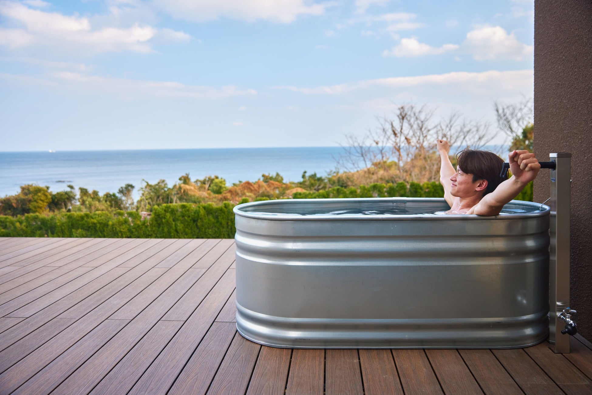 サウナから水風呂、外気浴へと自然に移行できる動線設計により、スムーズな “ととのい” 体験を実現。屋外に出れば、目の前には海と空が広がり、潮風を感じながらクールダウンが可能です。