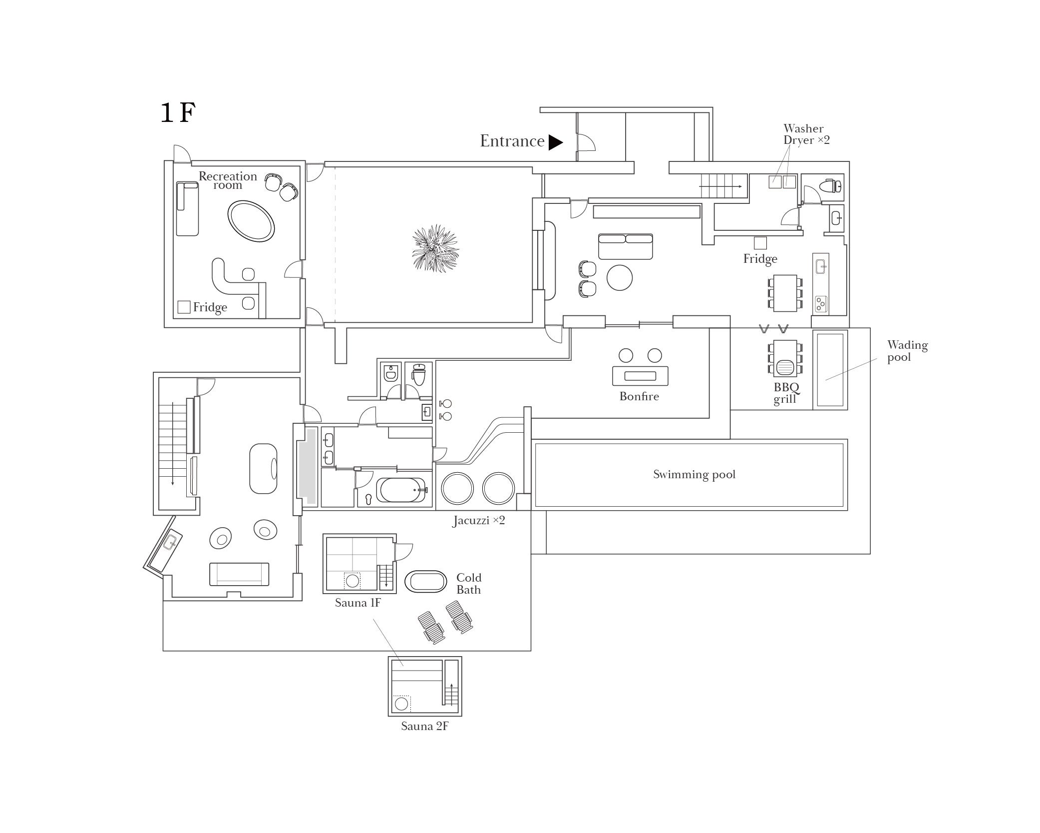 サウナ、水風呂、ジャグジー(2台)、シャワー(テラス2基)、プール、焚き火、BBQコンロ、浴室
