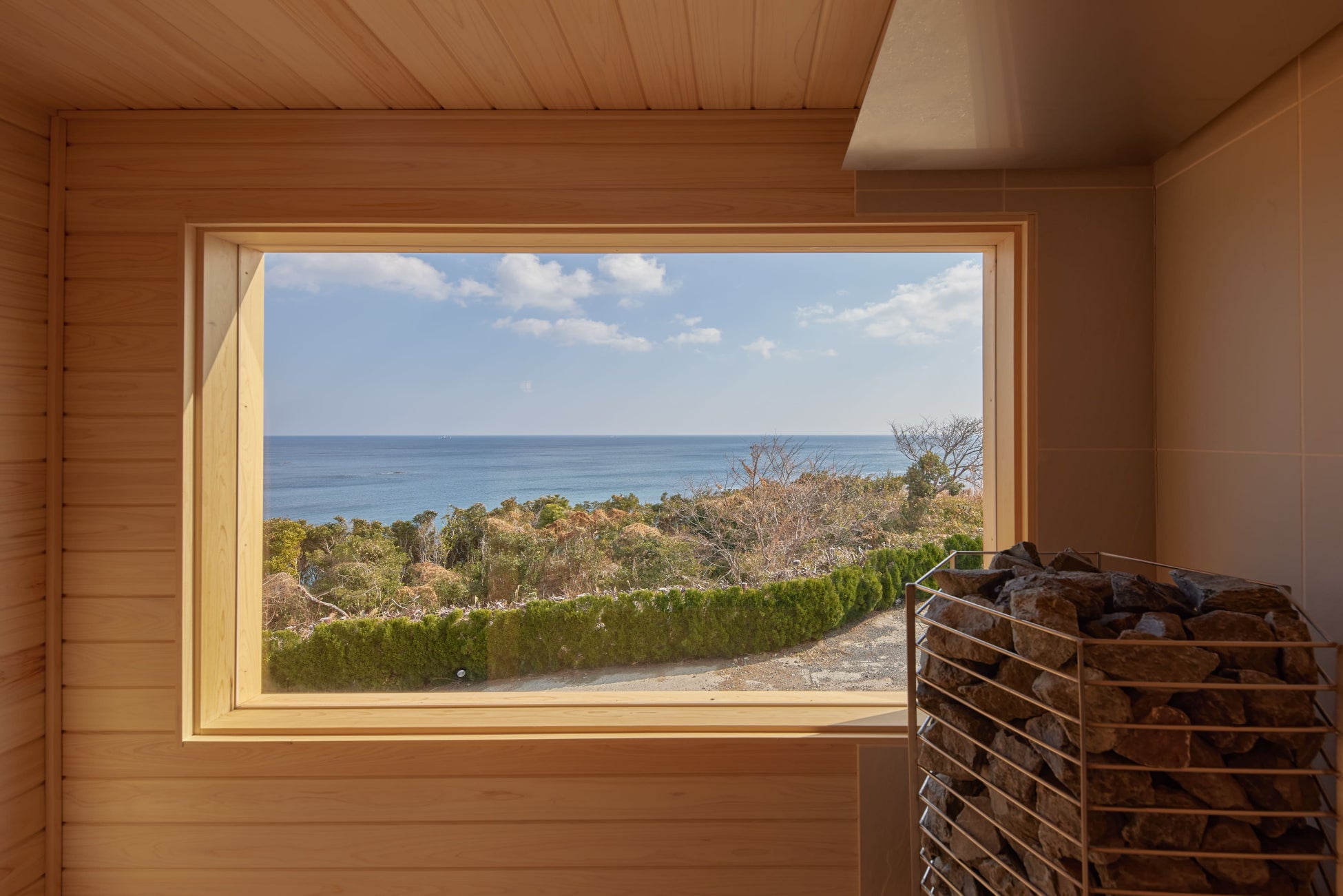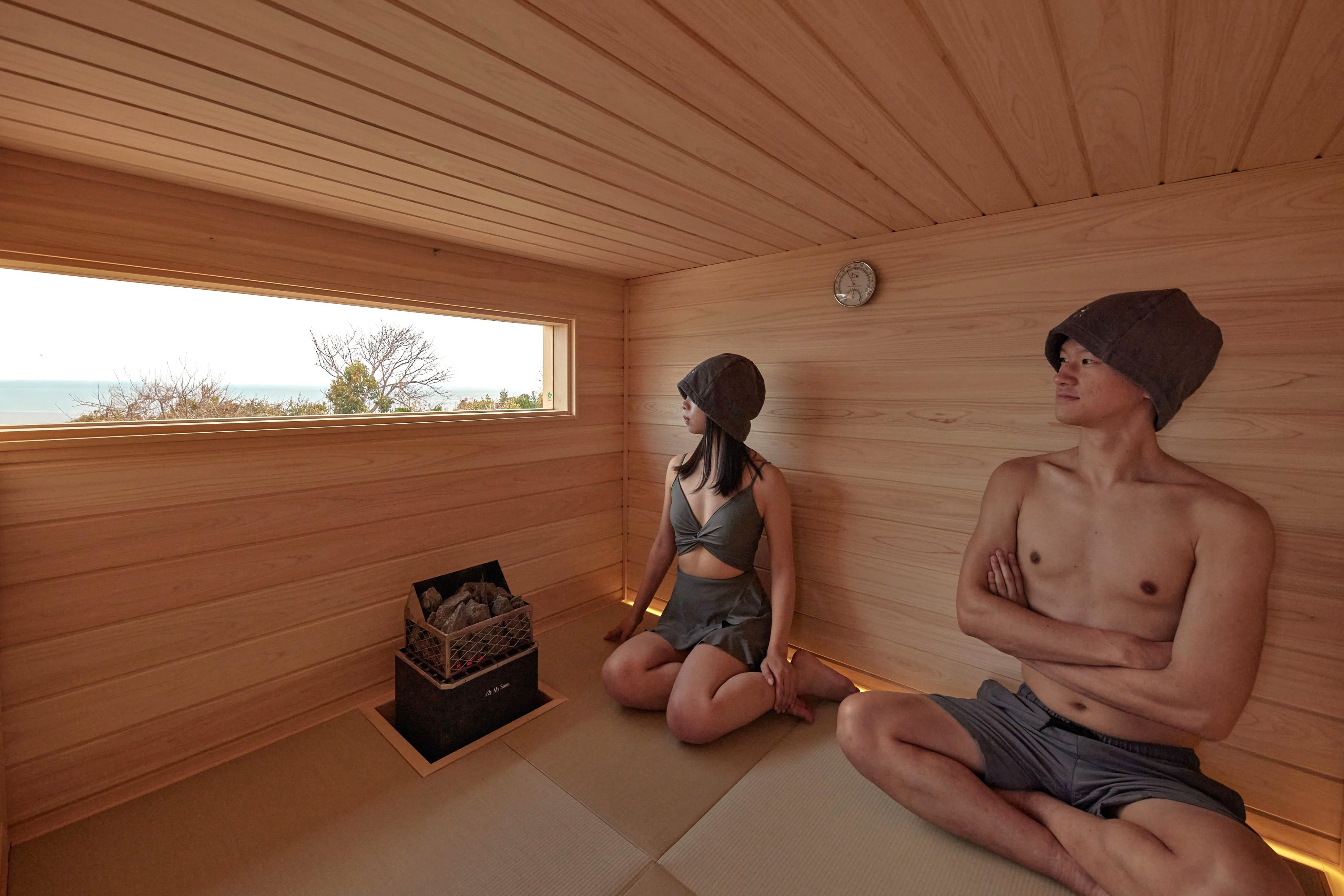 1階は水平線とほぼ同じ目線で景色を望める設計となっており、畳の座面でゆったりと身体を温めることができます。2階からは海を見下ろすような視点から景色を楽しめる空間に。