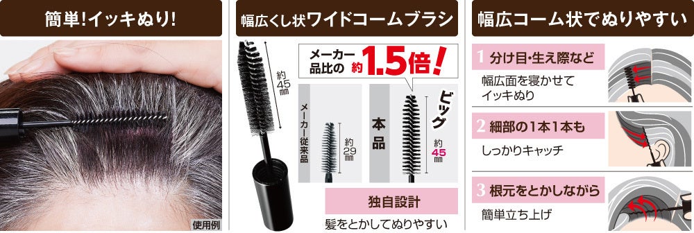 メーカー品比約1.5倍、約45mmの幅広クシ状ワイドコームブラシで広範囲の白髪も簡単にぬれます。