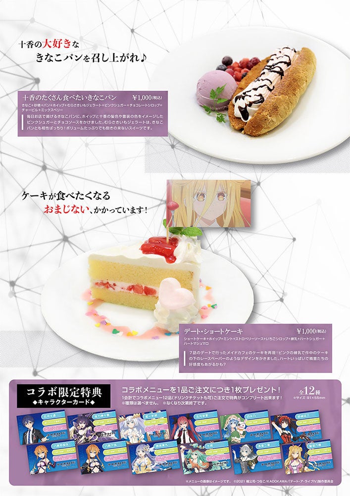 コラボカフェでは、夜刀神十香の大好きな「きなこパン」のスイーツプレート「十香のたくさん食べたいきなこパン」や時崎狂三が作り出す暗闇の結界〈時喰みの城〉をイメージした「狂三の〈時喰みの城〉パスタ」、主人公“五河士道”や精霊たちをイメージしたドリンクなど、コラボメニューをご用意しております。