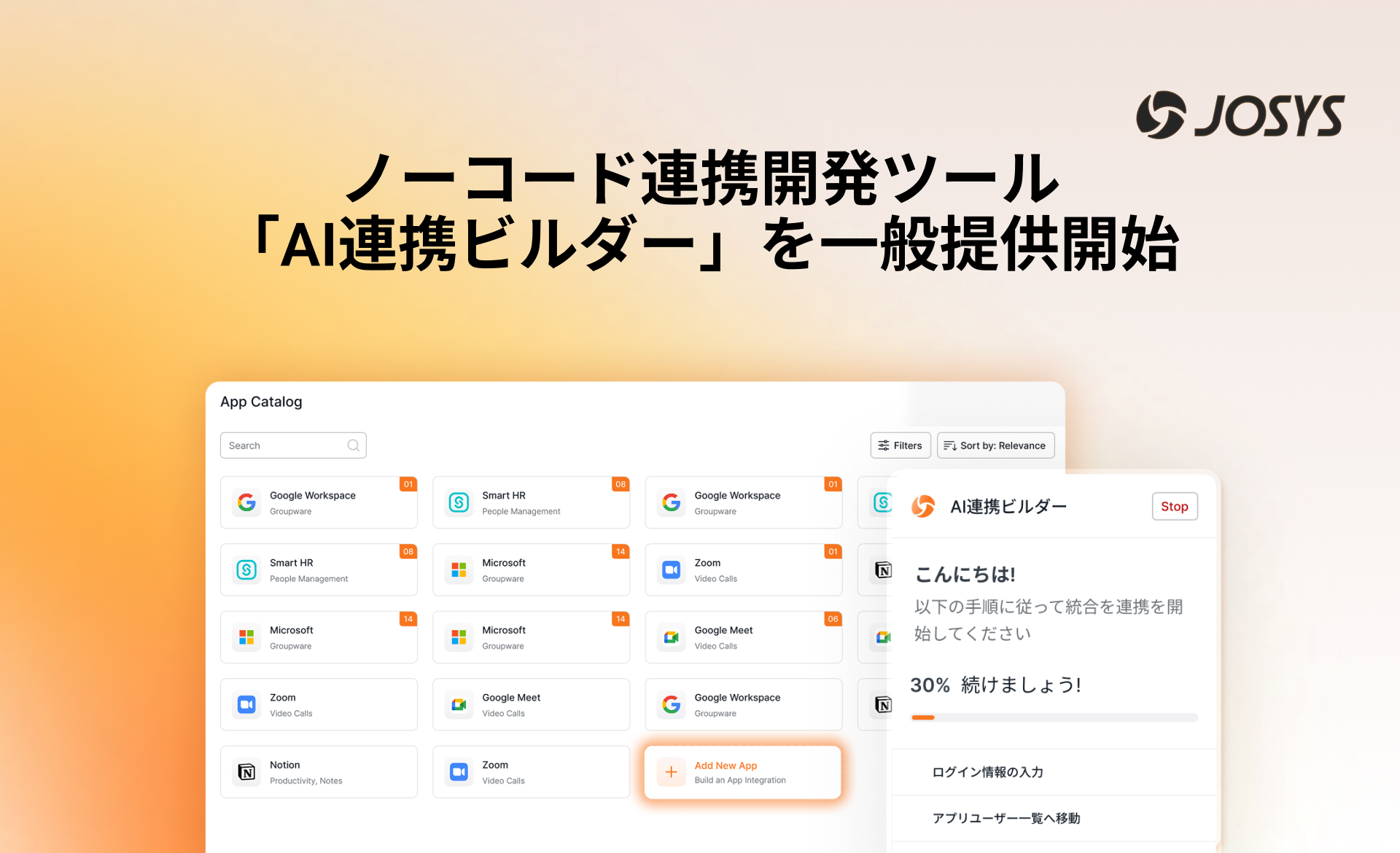 自律型SaaS管理クラウド「Josys」を提供するジョーシス株式会社(本社:東京都港区、代表取締役社長:松本 恭攝、以下「ジョーシス」)は、カタログ未掲載のアプリであっても即座に連携可能にする新機能「AI連携ビルダー(特許出願中)」を、本日より全てのユーザー向けに一般提供を開始したことをお知らせいたします。