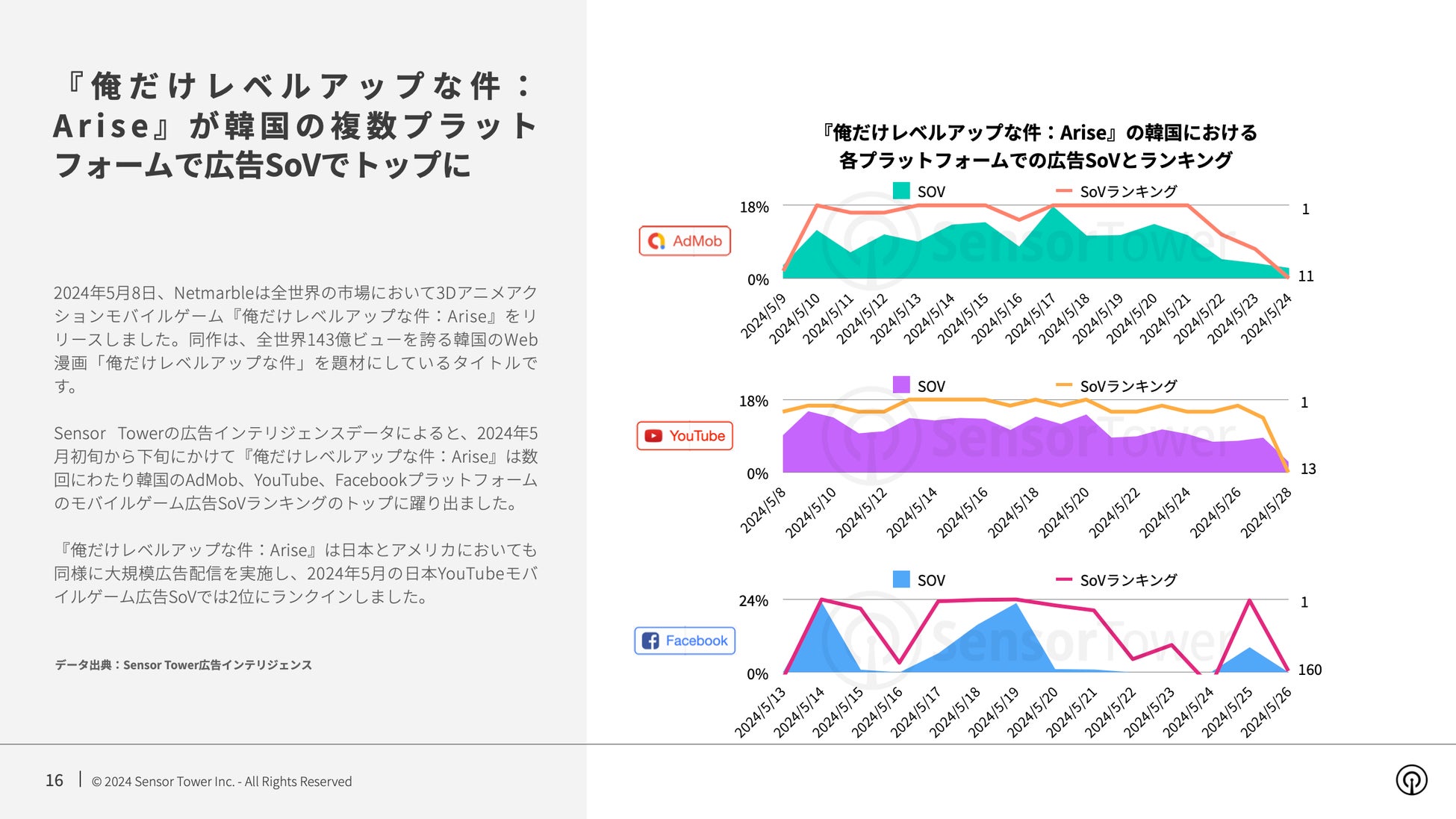Sensor Towerの広告インテリジェンスデータによると、2024年5月初旬から下旬にかけて『俺だけレベルアップな件:Arise』は数度にわたり韓国のAdMob、YouTube、Facebookプラットフォームのモバイルゲーム広告SoVランキングのトップに躍り出ました。