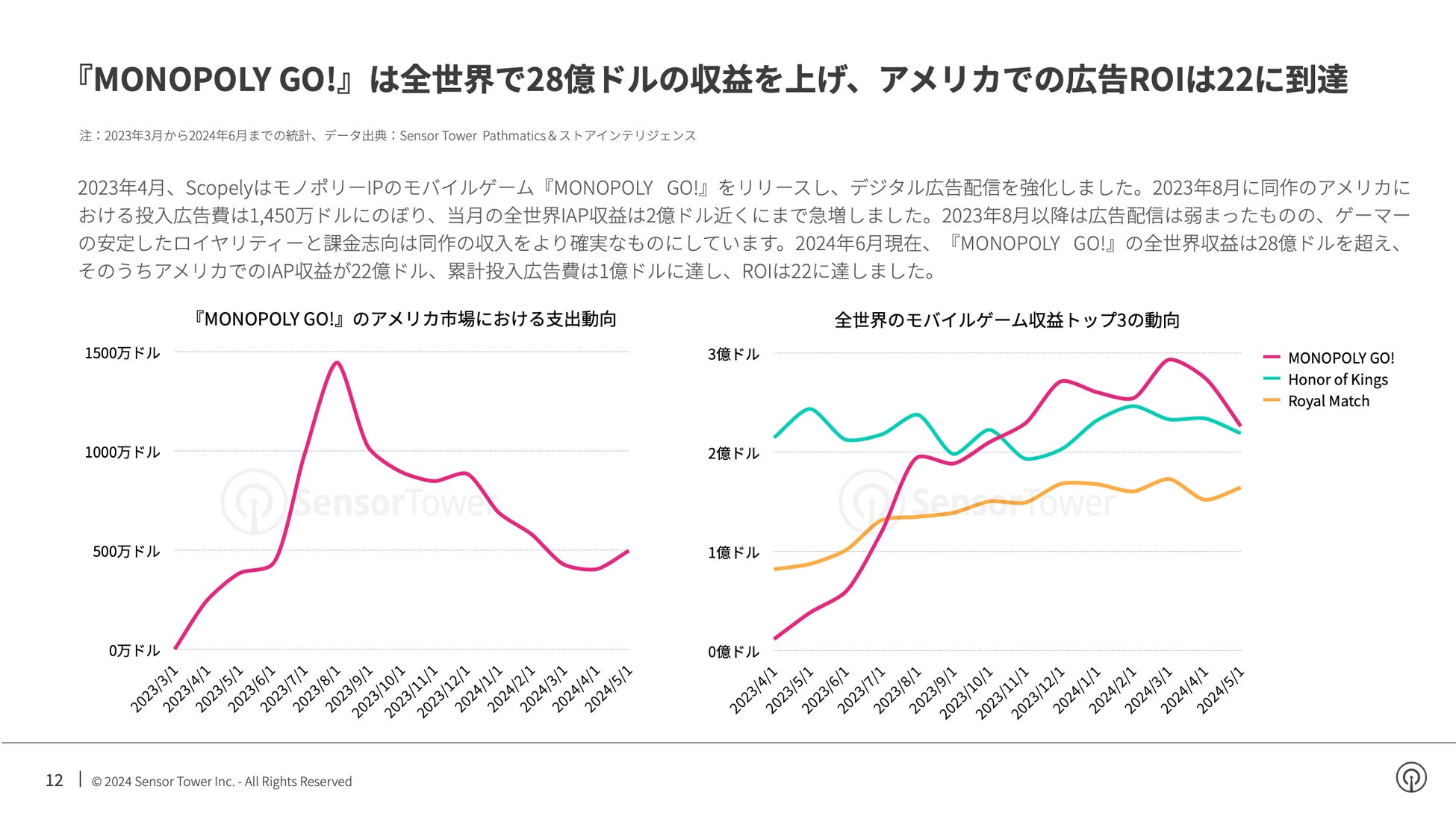 Sensor Towerデータによると、2024年6月現在、『MONOPOLY GO!』のアメリカにおけるデジタル広告総支出は1億ドル、累計IAP収益は22億ドルに達し、広告ROIは22に達したことを示しています。