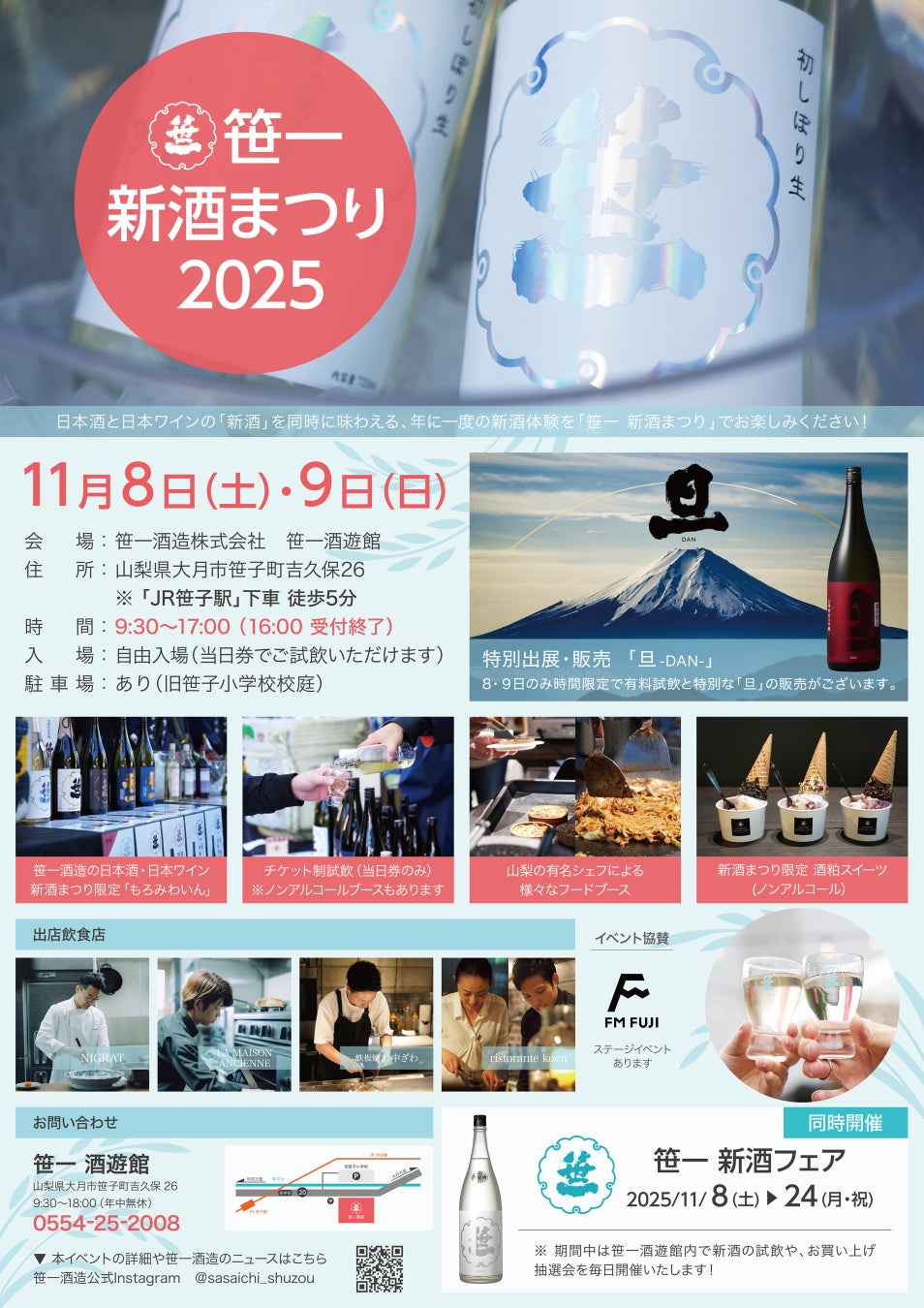 名称 :笹⼀新酒まつり 2025⽇時 :2025 年 11 ⽉ 8 ⽇(⼟) 、 11 ⽉ 9 ⽇(⽇)