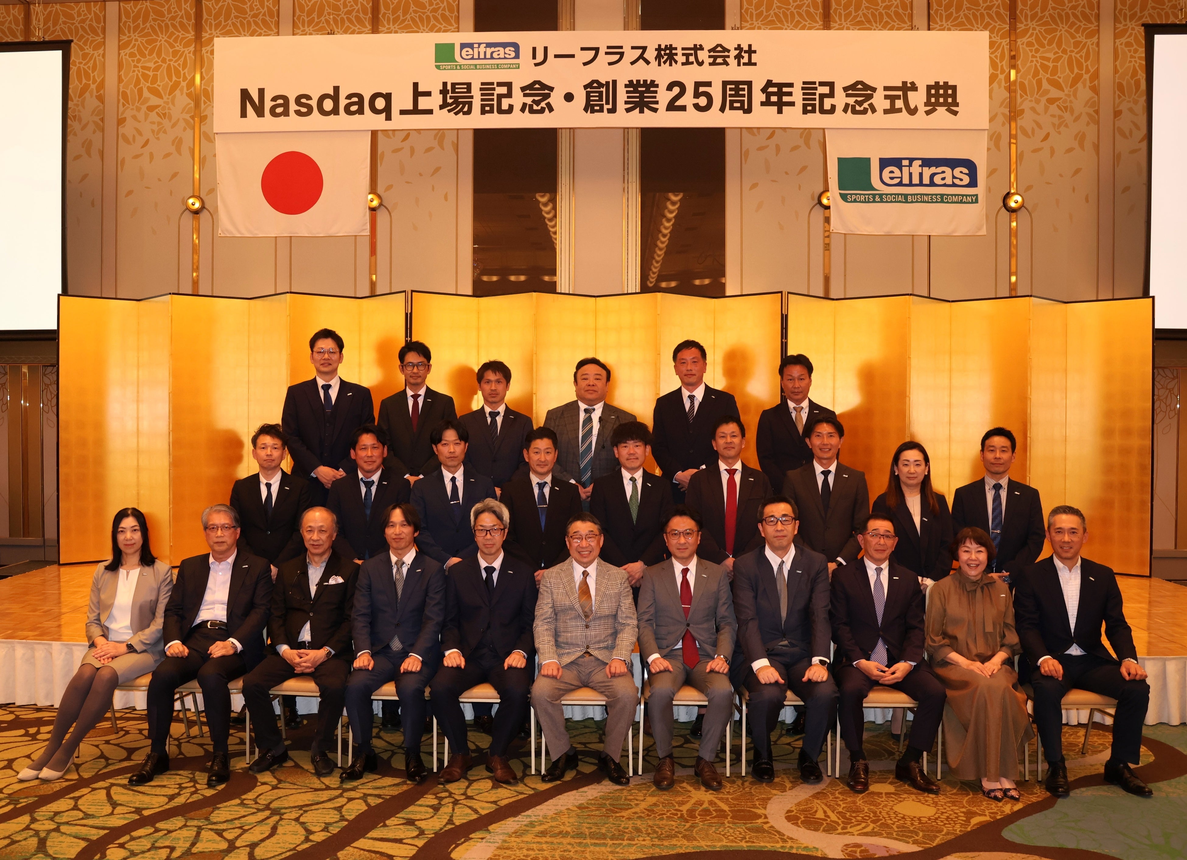 子ども向けスポーツスクールの運営や部活動地域展開支援などを行うリーフラス株式会社(LEIFRAS CO.,LTD.、Nasdaq:LFS、本社:東京都渋谷区、代表取締役CEO:伊藤 清隆)は、2025年10月のNasdaq市場への上場ならびに創業25周年を記念した式典を挙行いたしました。創業の地である福岡において、これまで当社を支えていただいたステークホルダーの皆様へ感謝を伝えるとともに、第2創業期に向けたさらなる飛躍と社会課題解決への決意を表明いたしました。
