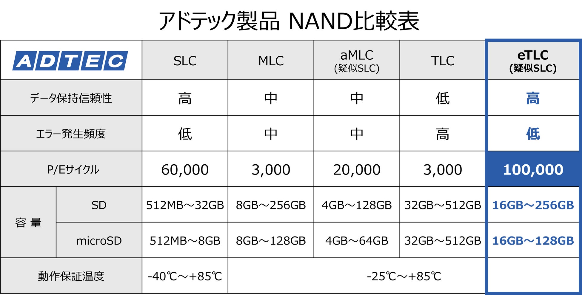 TLCベースでありながらSLCと同等レベルのデータ保持信頼性を実現し、さらにP/Eサイクルを大幅に向上したeTLC(expansion TLC)タイプの「産業用SD」と「産業用microSD」です。