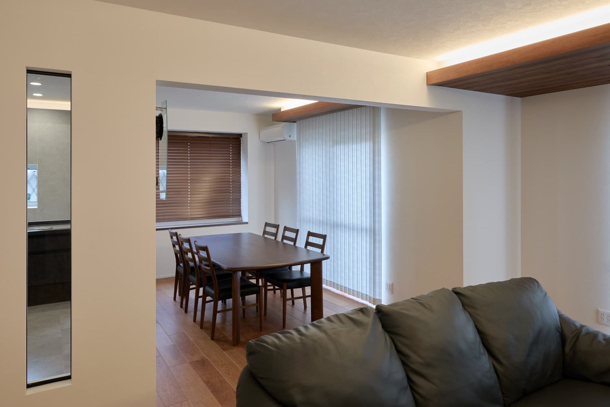 2×4(ツーバイフォー)住宅だったため大きな間取り変更は行わず、リビング⇔キッチンの間仕切り壁の一部をガラス開口にして、空間に繋がりを持たせました。リビングからダイニングを通して下がり天井を造作することで、より広々としたLDKを演出しています。