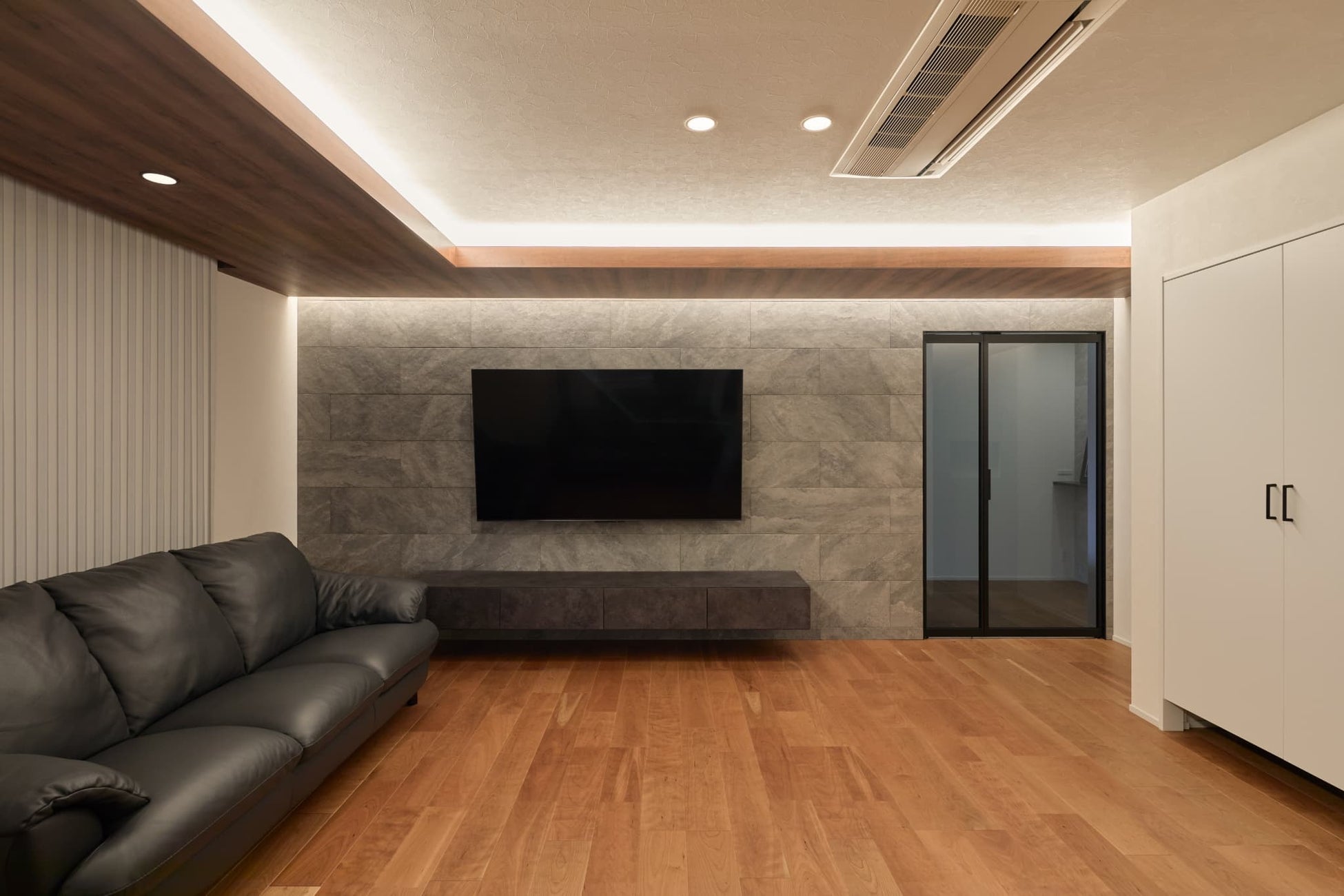 造作の下がり天井とエコカラットがリビングの主役。下がり天井には間接照明を入れることで、高級感が引き立ち、空間全体がホテルライクな雰囲気に仕上がりました。