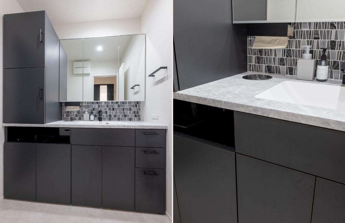 造作洗面だからこそ計画できる埋め込み式のゴミ箱を取り入れ、機能的でスタイリッシュなデザインに仕上げました。さらに、洗濯物用ボックスを設けることで、乱雑になりがちな脱衣室をいつでもスッキリと保つことが出来ます。