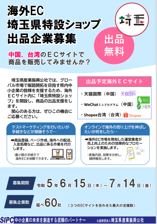 「埼玉県特設ショップ」への出品やその他の海外ECサイトへの出店を検討している県内中小企業の皆様の応募をお待ちしております。
