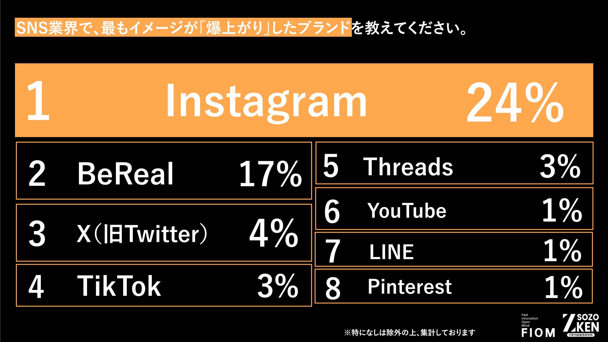 Z世代向けクリエイティブカンパニーFiom合同会社(本社:東京都渋谷区、代表社員:竹下洋平)が運営する、Z世代当事者が実態や価値観を分析するシンクタンク「Z-SOZOKEN(Z世代創造性研究所)」 は、全国のZ世代(18歳〜24歳)の300名を対象に実施した、食品、コスメ、アパレル、エンタメなど全19部門にわたる「Z世代のイメージが爆上がりしたブランドランキング」 の最新調査レポートより、SNS部門の動向を深く考察した第一弾インサイトサマリーを独自に公開いたしました。
