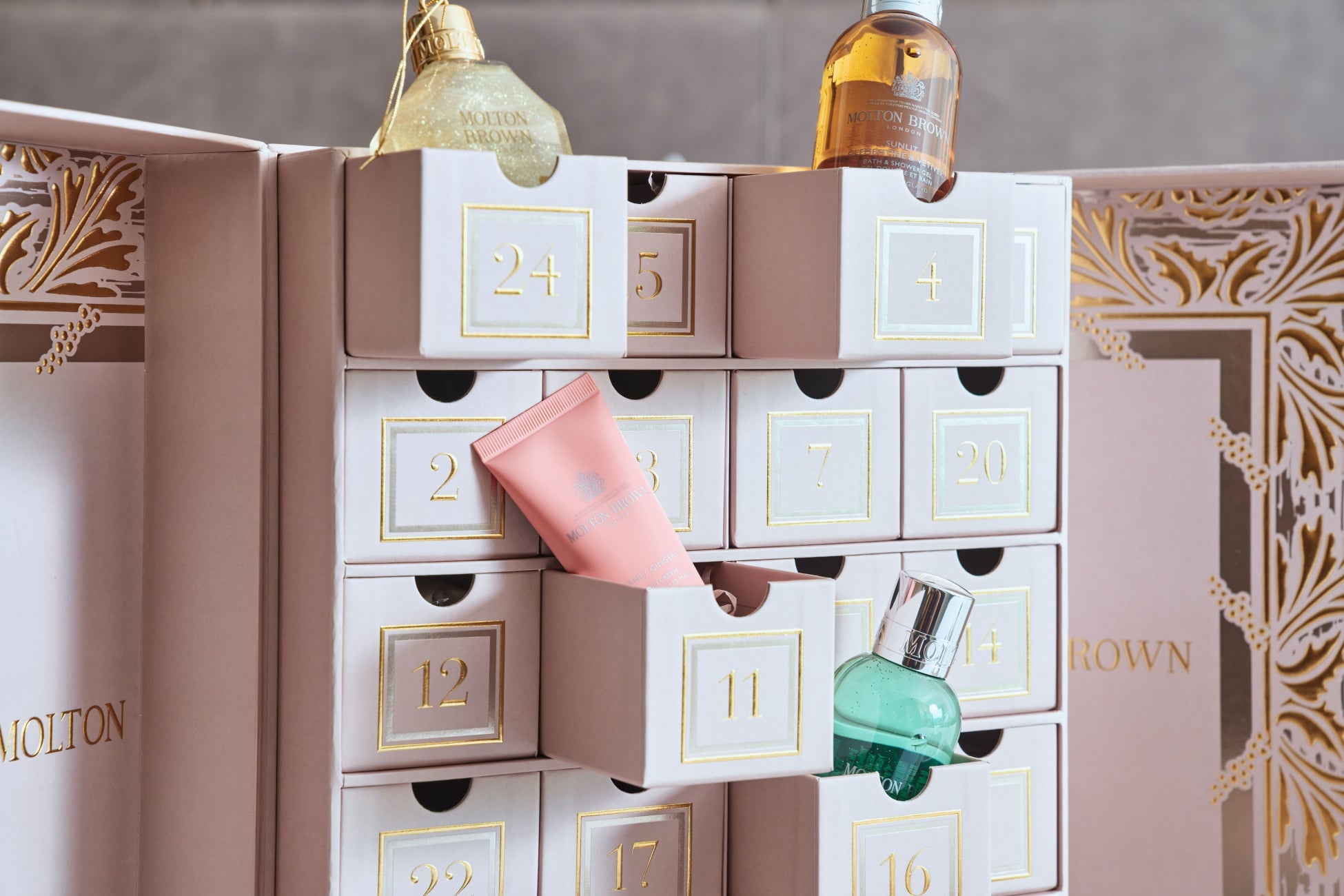 プラン①【Premier Christmas Stay with Molton Brown】 ピンクにゴールドをあしらった煌めく額縁をモチーフにしたボックスの中には、モルトンブラウンの人気ボディケアやフレグランス全24品を豪華に詰め合わせました。年に一度、この時期限定の「Advent Calendar」が付いたプランです。