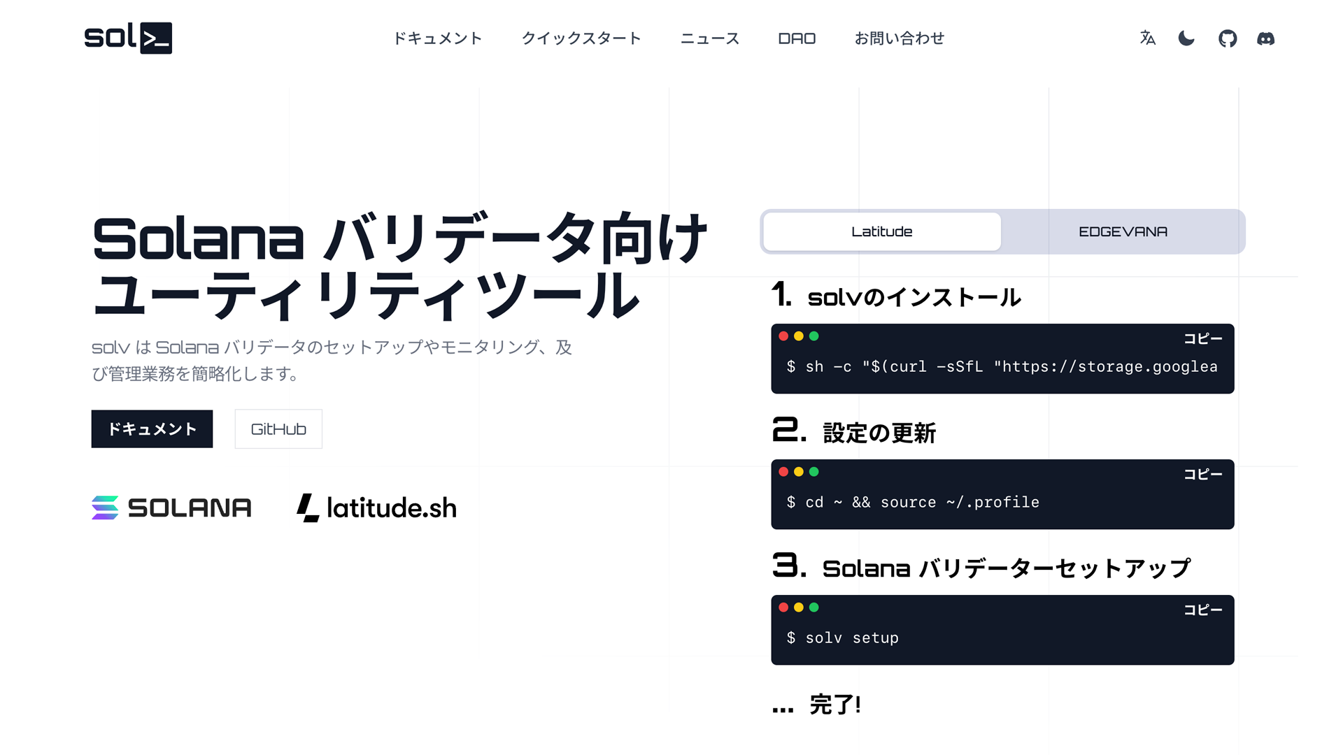 Latitude は高いコストパフォーマンスながら、いまだかつてない品質、ローレイテンシーでハイスペックのベアメタルクラウドサーバーリソースをグローバルに提供しています。しかもそれらは数クリックで一瞬で立ち上がるので、あとは solv をインストール、有効にして走らせるという簡単な 3 ステップですぐに Solana バリデーターを立ち上げられます。Latitude と solv のコラボは Solana ブロックチェーンバリデーターの参入障壁を取り除くとともに、サステナブルな運用体制を構築できます。複数台バリデーター運用の効率化や他チェーンへの展開など、このコラボレーションの可能性に大きく期待しています。