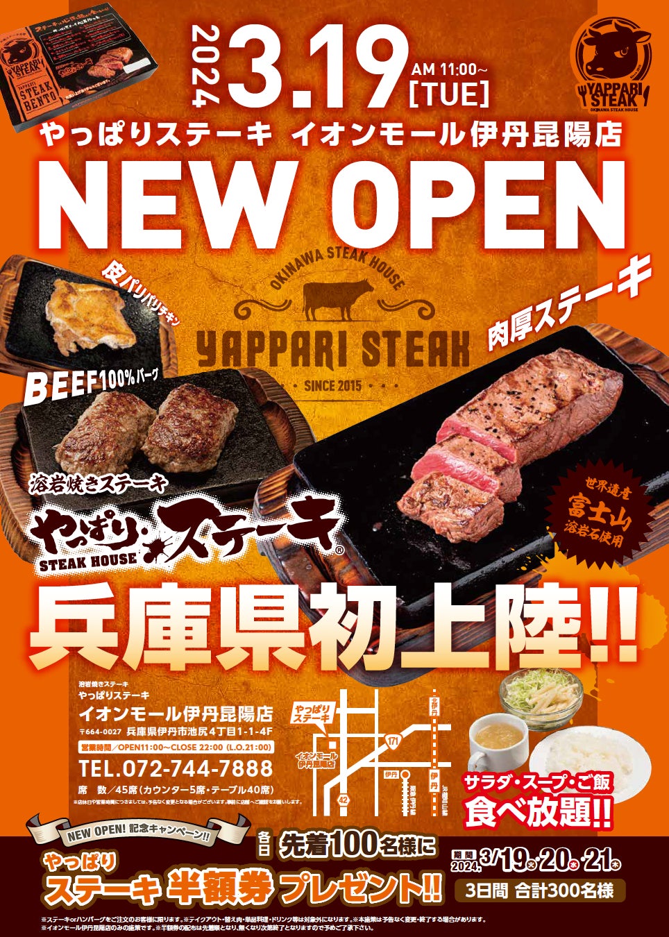 ■3月19日にやっぱりステーキ伊丹昆陽店OPEN。19日〜21日の3日間