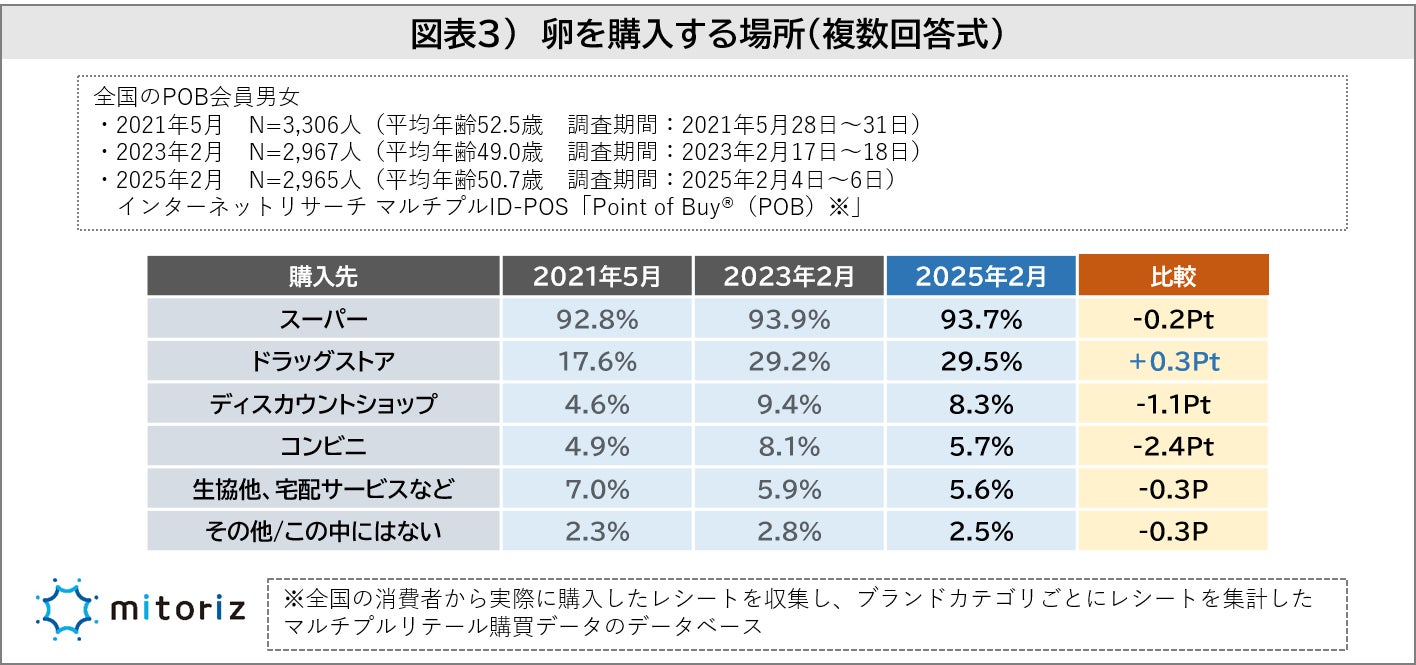 卵の購入先は「スーパー」が9割を超え最多も「ドラッグストア」での購入も3割に迫り定着か