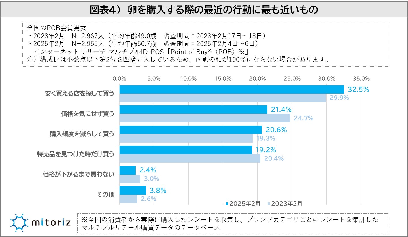 卵の購入は「安く買える店を探して買う」が32.5%、「価格を気にせず買う」は2023年から3.3Pt減少