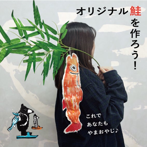 「山親爺」に登場する、“笹の葉を担いで鮭を背負った熊”の姿をイメージしたワークショップです。鮭の形をした生地に、絵の具やクレヨンで思い思いの模様や柄を描き、笹の葉に括り付けて完成!山親爺が背負っている鮭のような、あなただけの“オリジナル鮭”を作ろう!